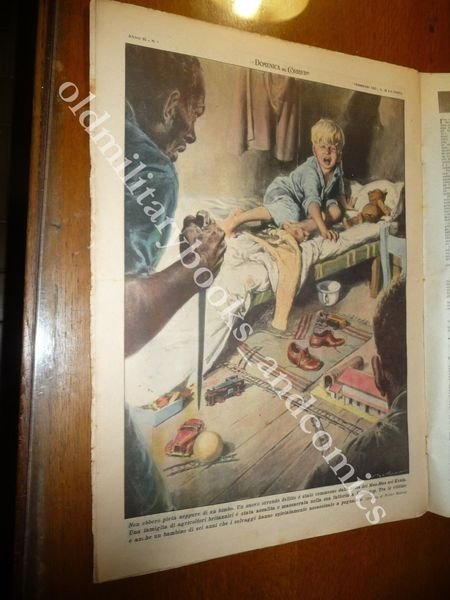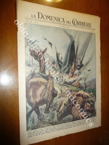 DESCRIZIONE: Domenica del Corriere, Milano, Anno 55 n. 6 (8 febbraio 1953). COPERTINA: Un bimotore partito da Elmas diretto a Roma cade dopo pochi minuti. RETRO: I Mau-Mau in Kenia uccidono coloni britannici La Domenica del Corriere è stato un popolare settimanale italiano fondato a Milano nel 1899 e chiuso nel 1989. Apparve per la prima volta nelle edicole l'8 gennaio 1899 come supplemento illustrato del Corriere della Sera. Stampata in grande formato (sul modello del domenicale La Tribuna illustrata), aveva 12 pagine e veniva distribuita gratis agli abbonati del Corriere, oppure si poteva acquistare in edicola per 10 centesimi. La prima e ultima di copertina erano sempre disegnate. Il Corriere si avvaleva di un giovane disegnatore, Achille Beltrame, allora sconosciuto, a cui veniva affidato in ogni numero il compito di rendere con la sua tavola il fatto più interessante della settimana. Dopo la sua morte nel 1945, fu sostituito da Walter Molino che, come il suo predecessore, firmò memorabili copertine. A differenza dei settimanali dell'epoca, la Domenica del Corriere diede ampio spazio alle fotografie e ai disegni, e questo fu uno dei motivi del suo successo. CONDIZIONI: Buone con spillette, con sovracc. azzurrina. PESO / WEIGHT: 92 gr. without package.