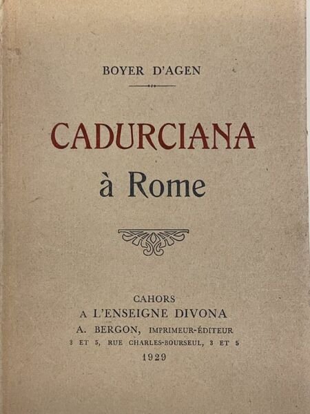Cahors a l'Enseigne 1929 Cahors a l'Enseigne Divona / A. Bergon 1929, petit In-8 broché, 63 pages. Petit manque de papier en partie inférieure du 1° plat et trou de ver au 2° plat sans gravité. Bel envoi autographe au sculpteur Denys PUECH. Bon état malgré les deux petits défauts signalés.