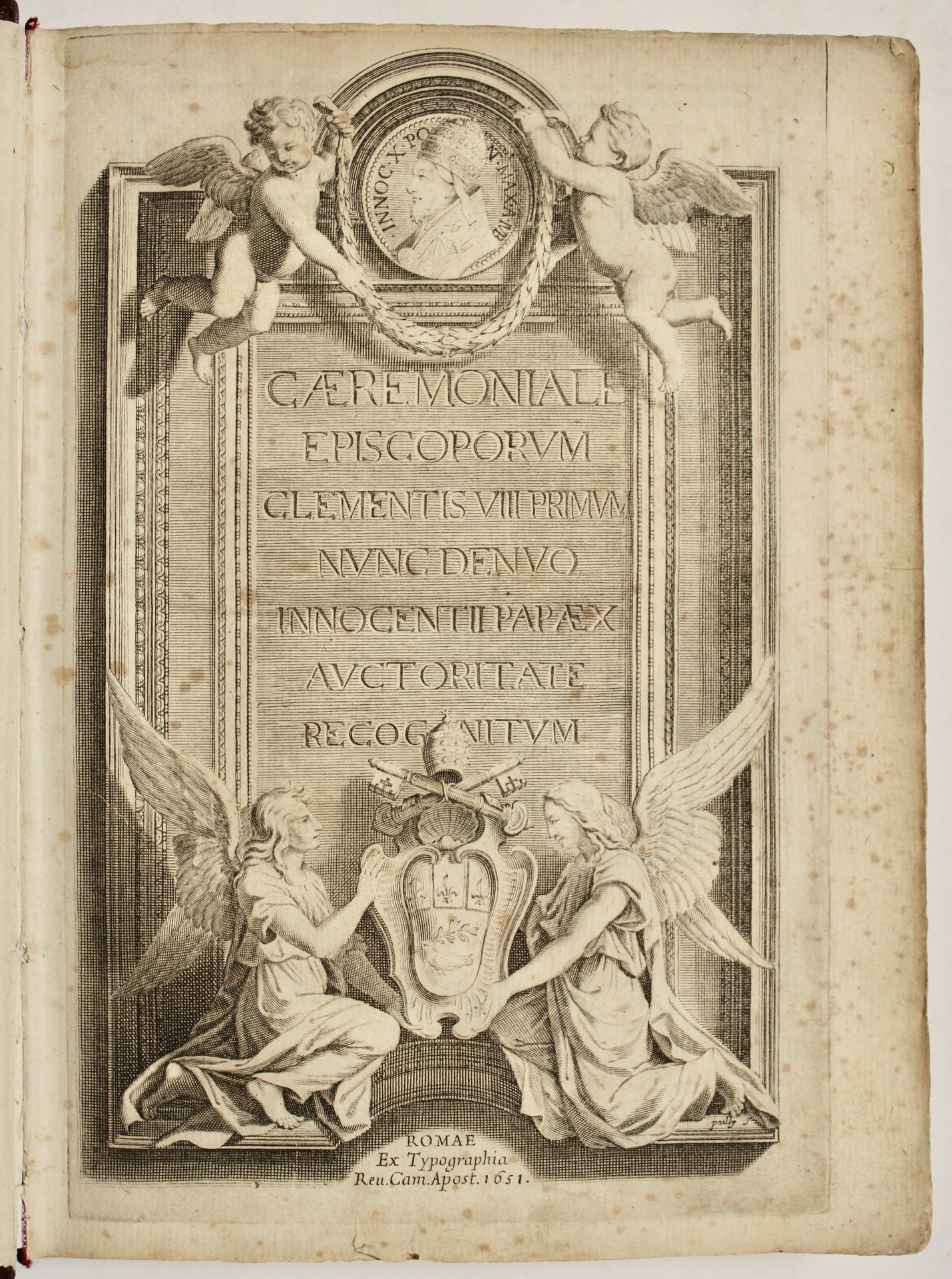 In 8° (mm 235x170); pagg. (16), 408; front. In rosso e nero, antiporta in rame con ritratto di Innocenzo X e 60 inc. a mezza pagina, testo in rosso e nero inquadrato in lineare cornice nera, iniziali silografiche, fregi. Legatura moderna in mezza pelle liscia con tit. al dorso. Bel figurato che illustra tutti i momenti del cerimoniale. Complessivamente buon esemplare con qualche piccola macchia e fioritura, in genere un po' arrossato.