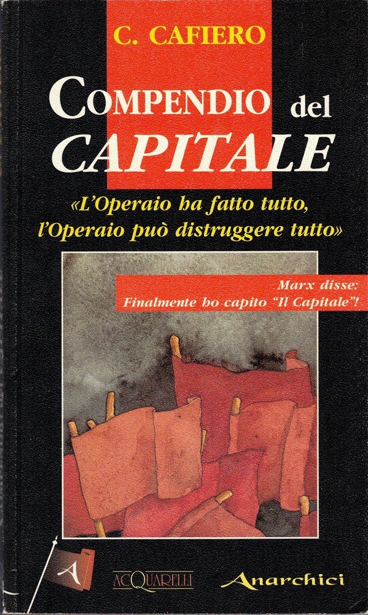 Carlo Cafiero, Compendio del Capitale. L’Operaio ha fatto tutto, l’Operaio può distruggere tutto, Demetra, Bussolengo 1996, prima ed., pp. 124, cm 20, br. ed. Collana Acquarelli. Serie Anarchici, vol. 136. Copertina di Giulia Pianigiani. Minima brunitura della carta, per il resto perfetto.