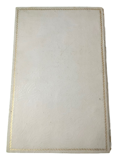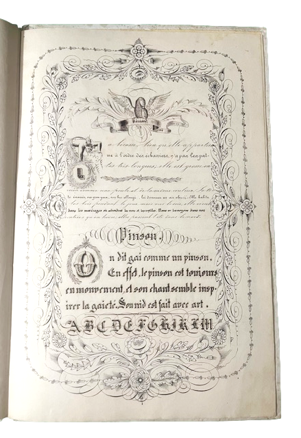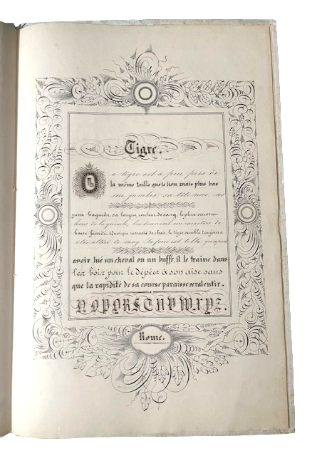In folio piccolo; (8) cc. Bella legatura in piena percallina rigida bianca con cornice in oro ai piatti. Piccolo difetto, con mancanza agli angoli alto e basso del dorso e nel complesso, all'interno, esemplare in ottime condizioni di conservazione. Tutte le tavole presentano una ricca cornice calligrafica a stamapa, all'interno della quale è presente un finissimo esempio calligrafico con vari caratteri di stampa. L'opera venne realizzata per il concorso di calligrafia che si tenne a Roma nel 1866. Rarissimo esempio calligrafico ottocentesco.