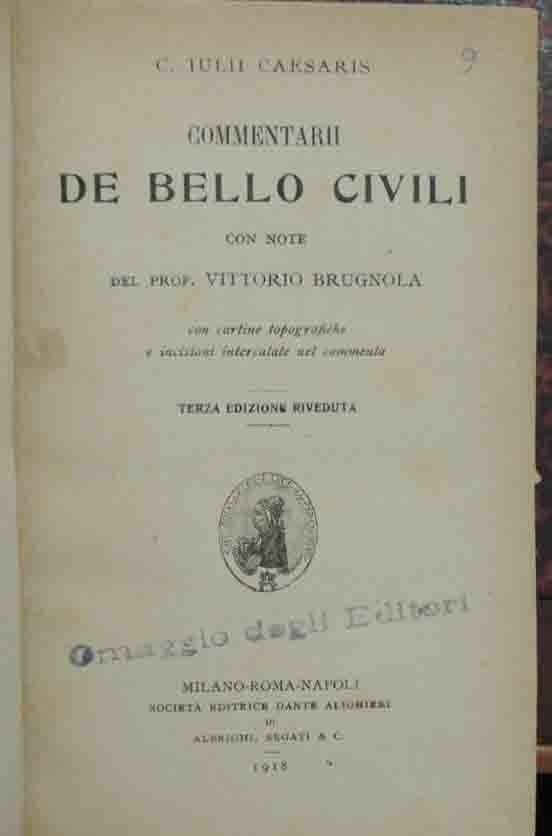 Caio Giulio Cesare, Commentarii de bello civili, con note del prof. Vittorio Brugnola, con cartine topografiche e incisioni intercalate nel commento, Società Editrice Dante Alighieri di Albrighi Segati e C., Milano 1918, terza ed. riveduta, pp. XIX, 324, ill. b.n., cm 19, legatura in mezza tela con titoli in oro al dorso. Timbro Omaggio degli Editori all’occhiello e al frontespizio. Leggere fioriture e bruniture, qualche sottolineatura a pastello e annotazione a lapis ai margini, per il resto molto ben conservato.