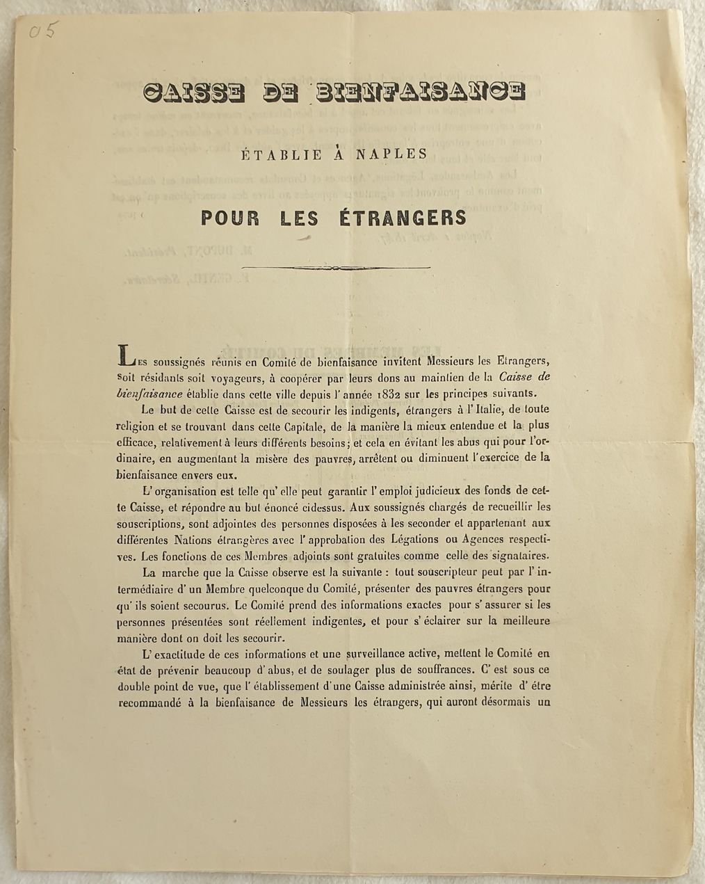 CAISSE DE BIENFAISANCE ETABLIE A NAPLES POUR LES ETRANGERS