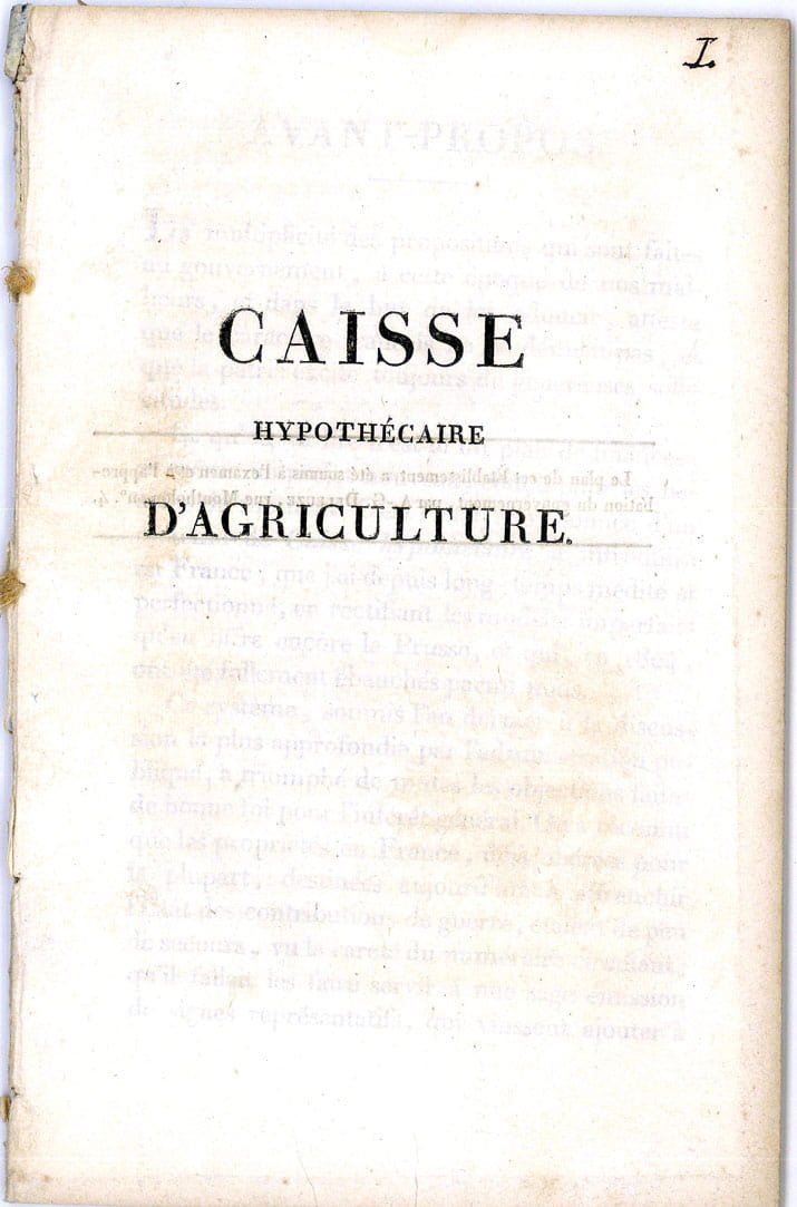 46 pages. 1 planche et 1 tableau dépliants hors-texte. (19,5x12,5 Cm). Dérelié. Projet de relance économique de la France au sortir des guerres napoléonniennes. L'auteur propose ici la création d'une caisse hypothécaire destinée aux propriétaires fonciers, envisageant d'une part la réunion de plusieurs capitalistes formant une compagnie de prêt, et d'autre part "la création et l'émission de billets au porteur". Il entendait sur ce dernier point se distinguer de la Banque de France par une meilleure gestion. La brochure contient notamment un modèle dépliant, gravé en taille douce, de bon émis par la Caisse et payable au porteur. Tableau progressif des opérations de la Caisse Hypothécaire d'Agriculture, pendant les cinq premières années, calculé sur le capital de 200 millions.
