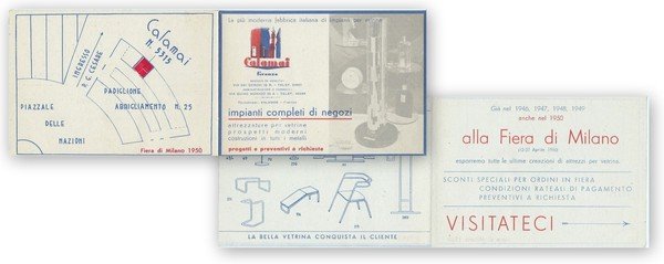 Calamai Firenze. Impianti completi di negoi, attrezzature per vetrine, prospetti moderni, costruzioni in tutti i metalli. Depliant pubblicitario Fiera di Milano 1950.