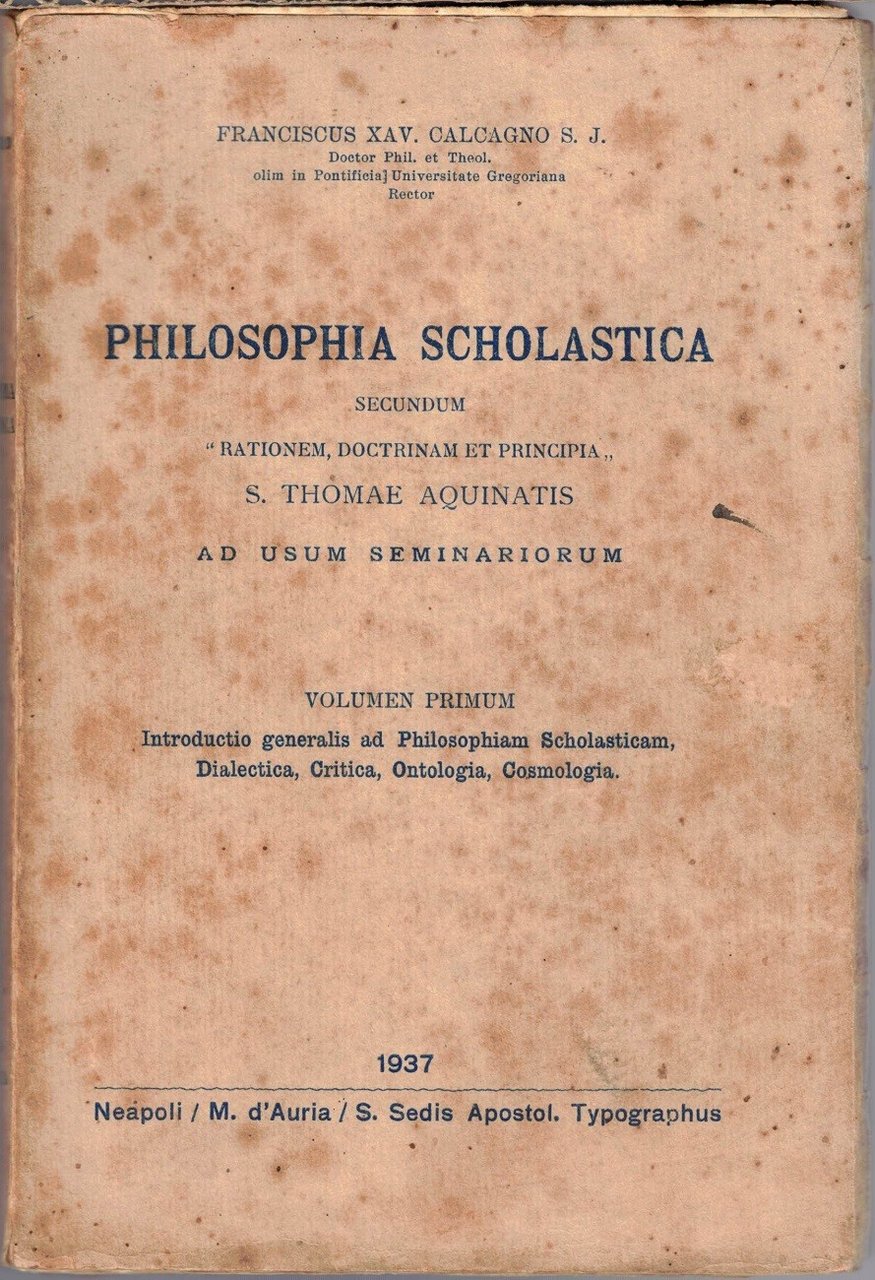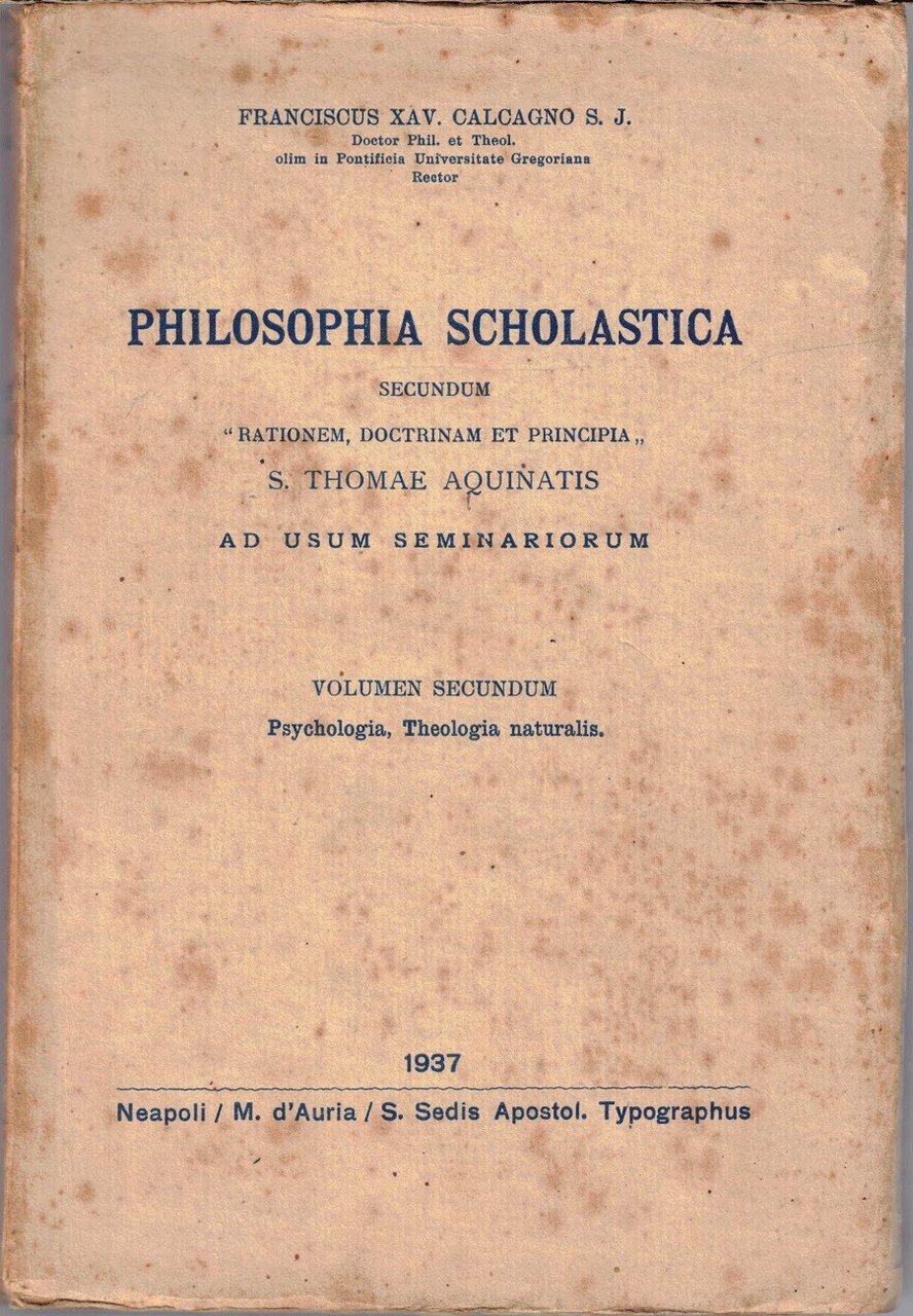 Franciscus Xav. Calcagno (Francesco Saverio Calcagno), Philosophia scholastica secundum rationem, doctrinam et principia S. Thoame Aquinatis ad usum seminariorum, M. d’Auria S. Sedis Apostol. Typographus, Neapoli 1937, pp. totali 1037, 2 voll. (Voll. I-II), cm 21, br. ed. Il lotto comprende i primi due volumi dell’opera (manca il terzo volume). Pubblicazione in lingua latina. Volume I: Volumen primum. Introductio generalis ad Philosophiam Scholasticam, Dialectica, Critica, Ontologia, Cosmologia, pp. 467. Vol. II: Volumen secundum. Psychologia, Theologia naturalis, pp. 570. Tracce d’uso, leggere annotazioni a lapis in grafia minuta ai margini, primo volume mancante di carta di guardia anteriore, ordinari segni del tempo, ma comunque nel complesso ancora buoni esemplari, di piena fruibilità e con brossure solide.