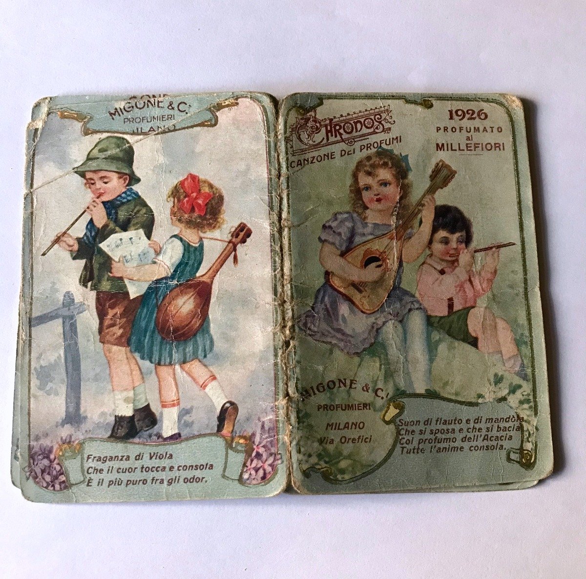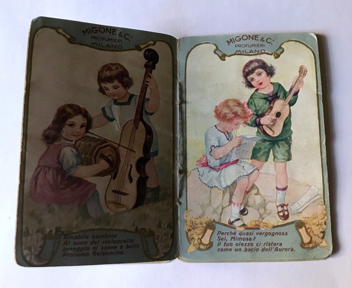 Calendarietto da barbiere, Calendarietto profumato Chrodos Migone Milano 1926 CART.0677 blu Migone, Milano, 1928; 6x9 cm; pp. 6 nn. Brossura ed. ill. a colori. Immagini cromolitografiche all'interno, calendario. Con Pubblicità all'interno. Condizioni di conservazione Calendario in ottimo stato di conservazione con segni del tempo prticolarmente i margini e agli angoli. Ricercato calendarietto con all' interno immagini di bambini e canzoni dei profumi. CART.0677 blu