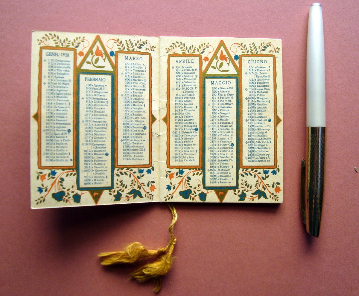 Calendarietto da barbiere, Calendarietto profumato Cinema 1928 S.d.t.; 1928; cm 9,5x7; pp. 12 nn. Brossura ed. ill. a colori con dorature. Immagini cromolitografiche all'interno, legatura con cordella colorata. Bella Grafica. Condizioni di conservazione Esemplare in buonissime condizioni con leggere bruniture. CART.2641 blu