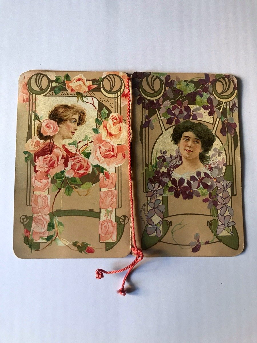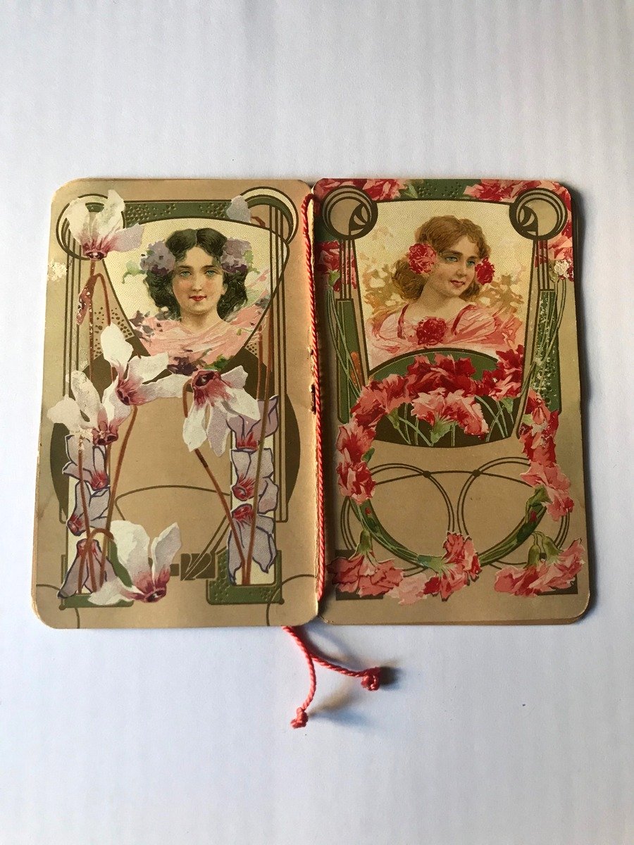 Calendarietto da barbiere, Calendarietto profumato Cromolitografie 1916 CART.0794 blu Senza dati tipografici , 1916; 8x10 cm; pp. 4 nn. Brossura ed. ill. a colori. Immagini cromolitografiche all'interno,con nastrino di legatura interno colorato, calendario. Eccezionale qualità tipografica in oro vivo e bellissimi motivi liberty. Condizioni di conservazione Calendario in ottimo stato di conservazione con minimi segni del tempo. Ricercato calendarietto von all'interno meravigliose grafiche e qualità tipografica in oro vivo. CART.0794 blu