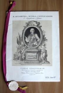 Re di Sardegna, Cipro, Gerusalemme etc. Fondatore della Regia Scuola Militare Teorico-pratica di Artiglieria e Genio. Bella illustrazione in b/n alla copertina. Cartellina editoriale, con cordoncino con stemma in fine, di 16 pagine. 24x31,5. Buonissimo stato. , Buono (Good)