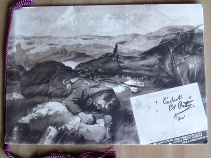 Bella illustrazione in copertina riproducente la cartolina scritta col sangue trovata presso il corpo del Lanciere Notte Alfredo dopo il combattimento. Cartellina editoriale con cordoncino, protetta da velina, e 8 pagine interne. 35x24,5. Buonissimo stato. , Buono (Good)