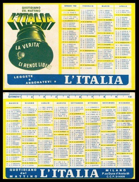 Calendario, calendarietto de L'Italia, quotidiano del mattino per il 1960.