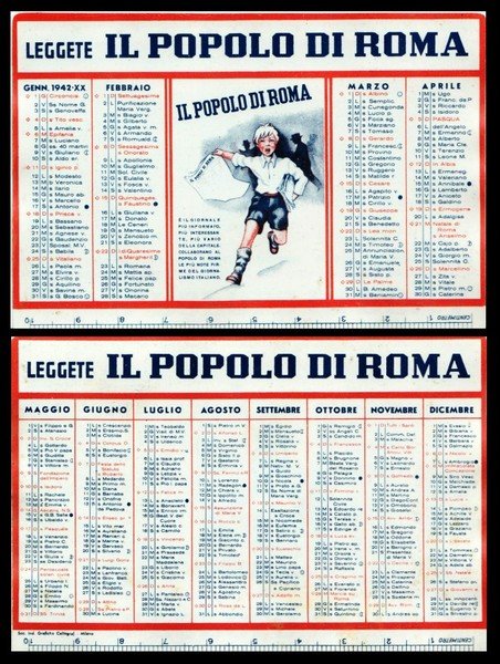 Calendario, calendarietto plastificato del quotidiano Il Popolo di Roma per l'anno 1942.