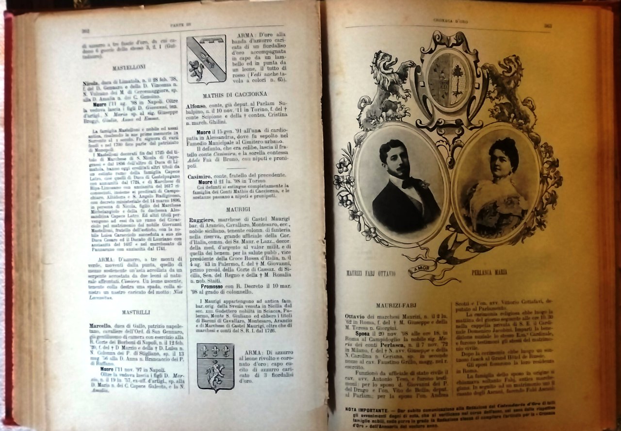 8° tela edit. rossa piatto anter. con cornice decorata, tit. oro e stemma dell'Ist. Araldico,tit. oro e fregi al dorso, pp. VIII-476, 90, 380, (8), 71 di reclàmes pubblic. Numerosi stemmi araldici e ritratti incisi. Legg. tracce d'uso margin. alla legat., una p. staccata, ma buon esempl.