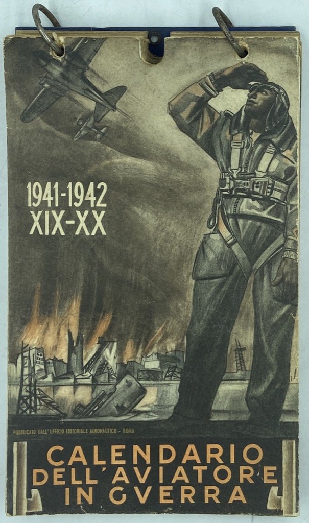 Calendario omaggio della rivista L’Aerotecnica, composto di 62 tavole cm 25 x 15 unite con anelli metallici entro copertine (illustrata a colori l’anteriore); ciascuna tavola, escluso il frontespizio, è composta da un breve testo che rievoca eventi aeronautici degli anni precedenti nei giorni della settimana relativa, dal calendario della settimana, e da una cartolina staccabile (tutte presenti in questo esemplare) con fotografie e illustrazioni di velivoli della Regia Aeronautica. Il calendario inizia il 28 ottobre 1941, e si conclude con l’ultima settimana del 1942. Strappato il lembo del foro passa-anello della copertina, lievi segni del tempo ma completo e molto ben conservato nel complesso.