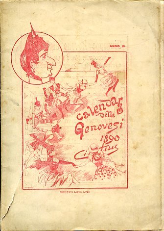 In-8°, pp. 76. (8) di pubblicità su carta azzurra; brossura editoriale con illustrazione in rosso (donne genovesi che si tengono per mano danzando). Pubblicità in rosso al piatto di tergo. Interamente illustrato con caricature di Cintius n.t. Buon esemplare. Bibliografia Nazionale - 1890, 176.