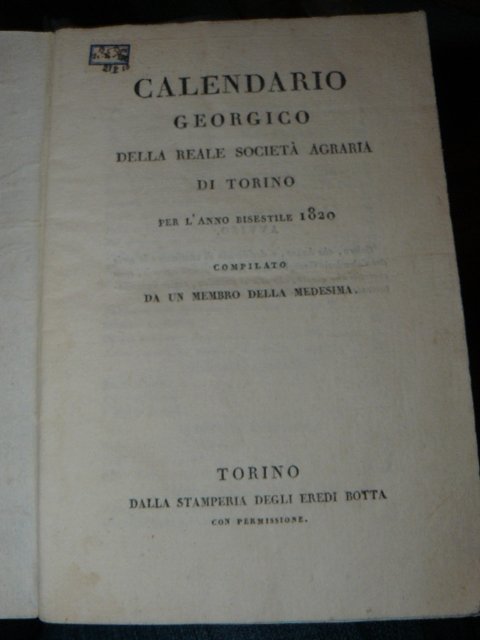 Calendario georgico della Reale Società Agraria di Torino per l'anno bisestile 1820 compilato da un membro della medesima.