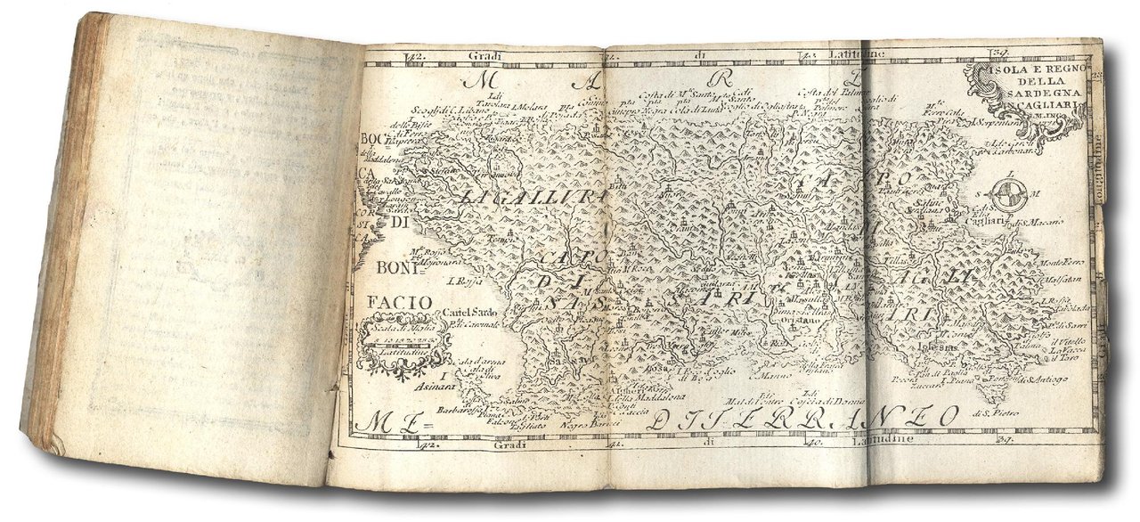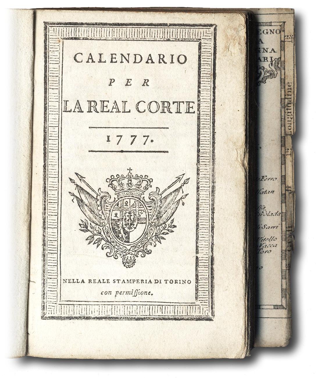 >in-12, ( 120 x 65 mm) pp. 143, brossura coeva in carta decorata. Armi sabaude al titolo, tutte le pagine entro bordura stilizzata, finalini. Rilegata in fine, rarissima e non riscontrata carta f.t. ripiegata raffigurante ''Isola e Regno della Sardegna in Cagliari. Lm Ing 1771''. Curioso calendario con introduzione di Giambattista Operti, professore di retorica e correttore della Real Stamperia; comprende anche sezioni dedicate alle date di nascita dei vari sovrani d'Europa ed elenchi dei vari cavalieri, cardinali e personale di servizio alla Corte Sabauda. Curiosa testimonianza storica impreziosita dalla rarissima carta geografica della Sardegna. Ottimo esemplare.