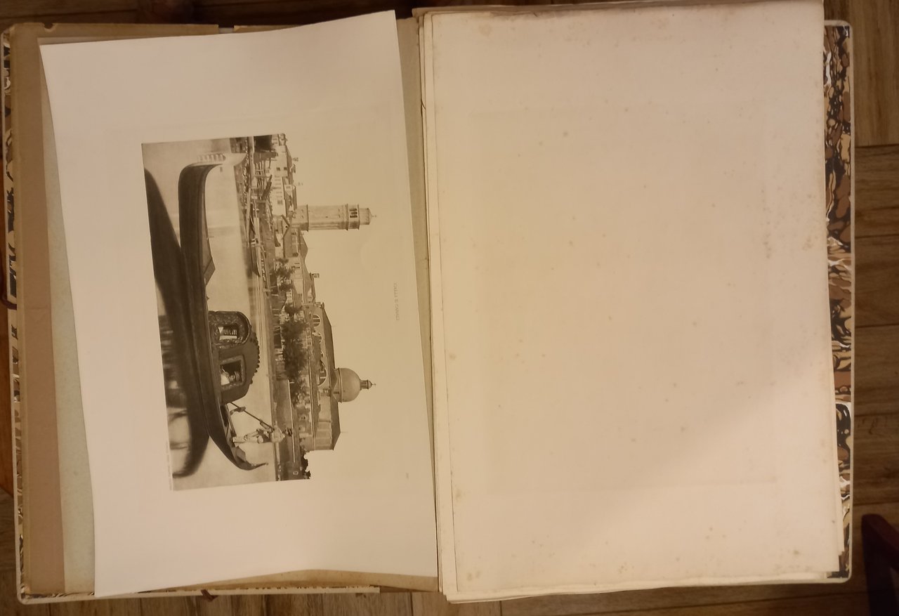 In-folio (57 x 39 cm) (8) 10 cartelle numerate (10 tavole sciolte ciascuna) In-8 1 fascicolo di indici. Cartella editoriale protetta da una cartella in semipelle, con piatti telati e contropiatti rivestiti di carta marmorizzata. Ultima tavola (N 100) molto chiara. Prima edizione di questa famosa opera composta da 100 fotoincisioni suddivise nei fascicoli originali in cui furono pubblicati all'eboca e contenuti nella cartellina originale. In-folio (57 x 39 cm) (8) 10 numbered folders (10 loose plates each) In-8 1 set of indexes. Publisher's folder protected by a semi-leather folder, with canvas boards and backboards covered in marbled paper. Last plate (N 100) very clear. First edition of this famous work consisting of 100 photoengravings divided into the original volumes in which they were published at the time and contained in the original folder.