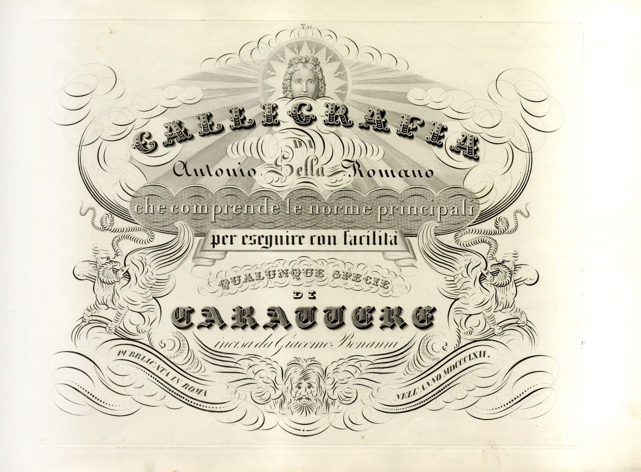 >in-folio oblungo (mm 355x505), leg. edit., tit. in oro al piatto ant. Completo di 70 tavole incise in rame dal Bonanni e da L. Masciarelli. Seconda edizione (prima 1840) accresciuta di 20 tav. rispetto alla prima di questo raro lavoro di calligrafia che tratta del carattere inglese, italiano, del rotondo, degli alfabeti stampati, del gotico, dei caratteri orientali e delle maiuscole inglesi legate insieme; ognuna delle sette sezioni è preceduta da un proprio frontespizio. Ottimo esempl. BONACINI 1682. MANCA A MARZOLI.