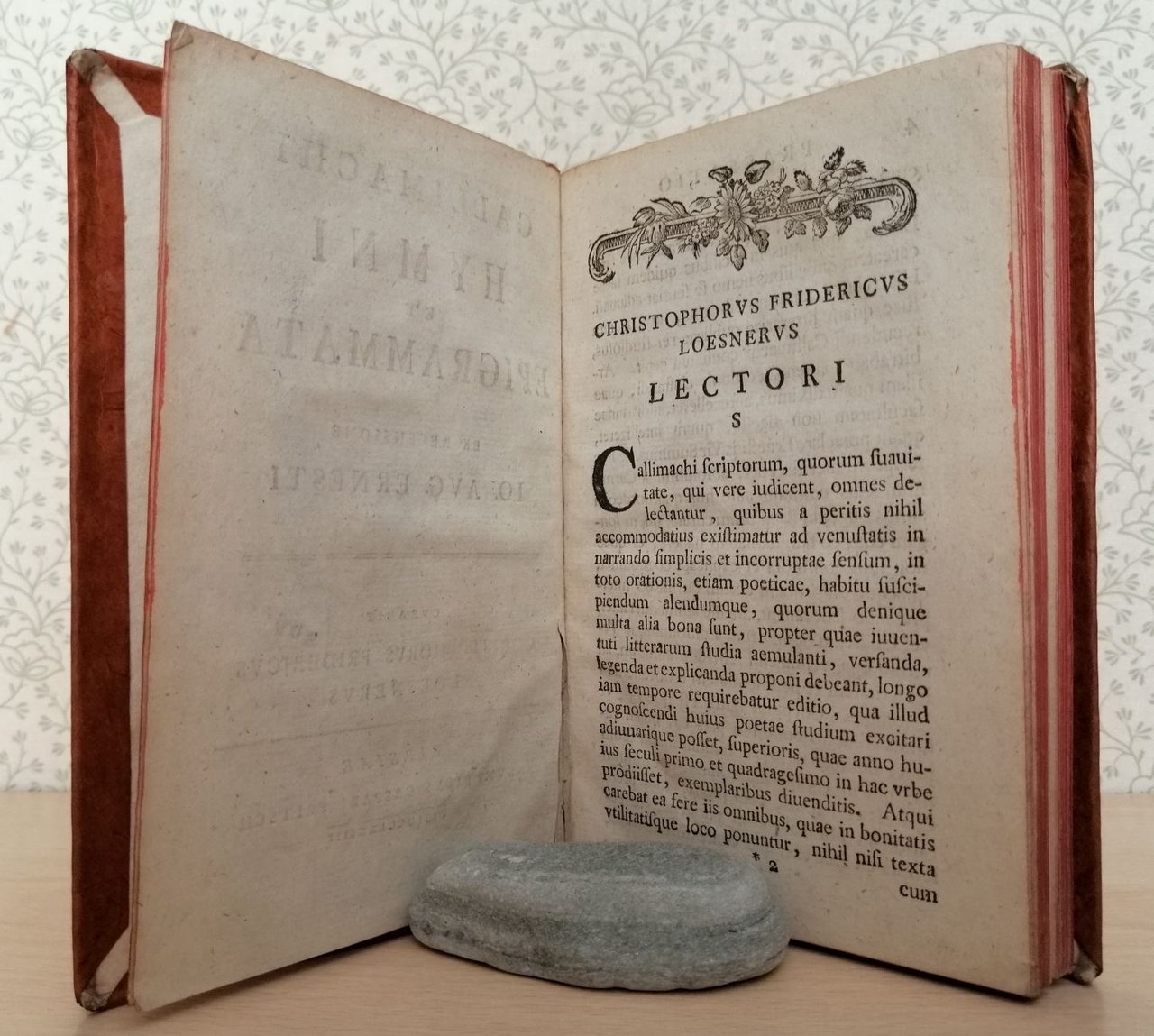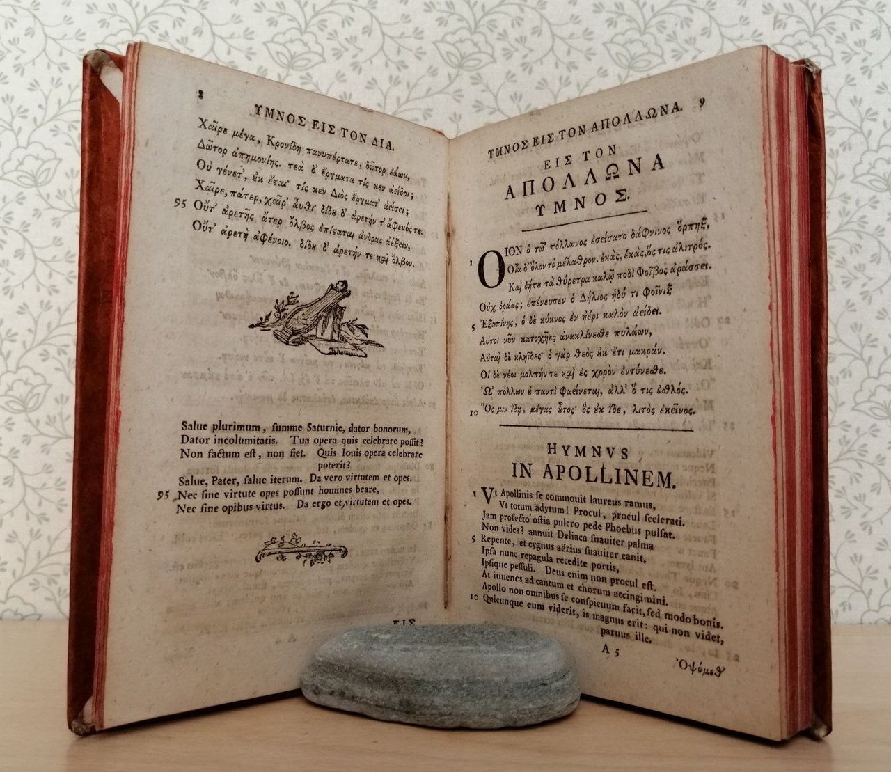 Volume in 8, bella cartonatura recente, tagli colorati, exlibris calcografico incollato, sguardie (scritte a pennino), antiporta col ritratto dell'Autore inciso in rame da Sissang, frontespizio (timbro d'antica raccolta), 6, 112 pp., 15 carte, 56 pp. del 'Maximi Tirii commentatio'. Bell'edizione degl'Inni ed Epigrammi in greco con traduzione latina in calce. Dell'opera del Poeta greco pleonastico discettare tanto nota ed apprezzata. Non resta che sottolineare la pi che bella conservazione, l'ottima impaginazione e l'accuratezza filologica del tomo proposto.