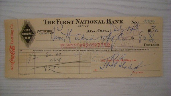 Cambiale/promissory note COCA COLA - First National Bank ADA (Oklahoma) 1930