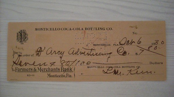 Cambiale/promissory note Monticello (Florida) COCA COLA - Farmers & Merchants Bank 1930