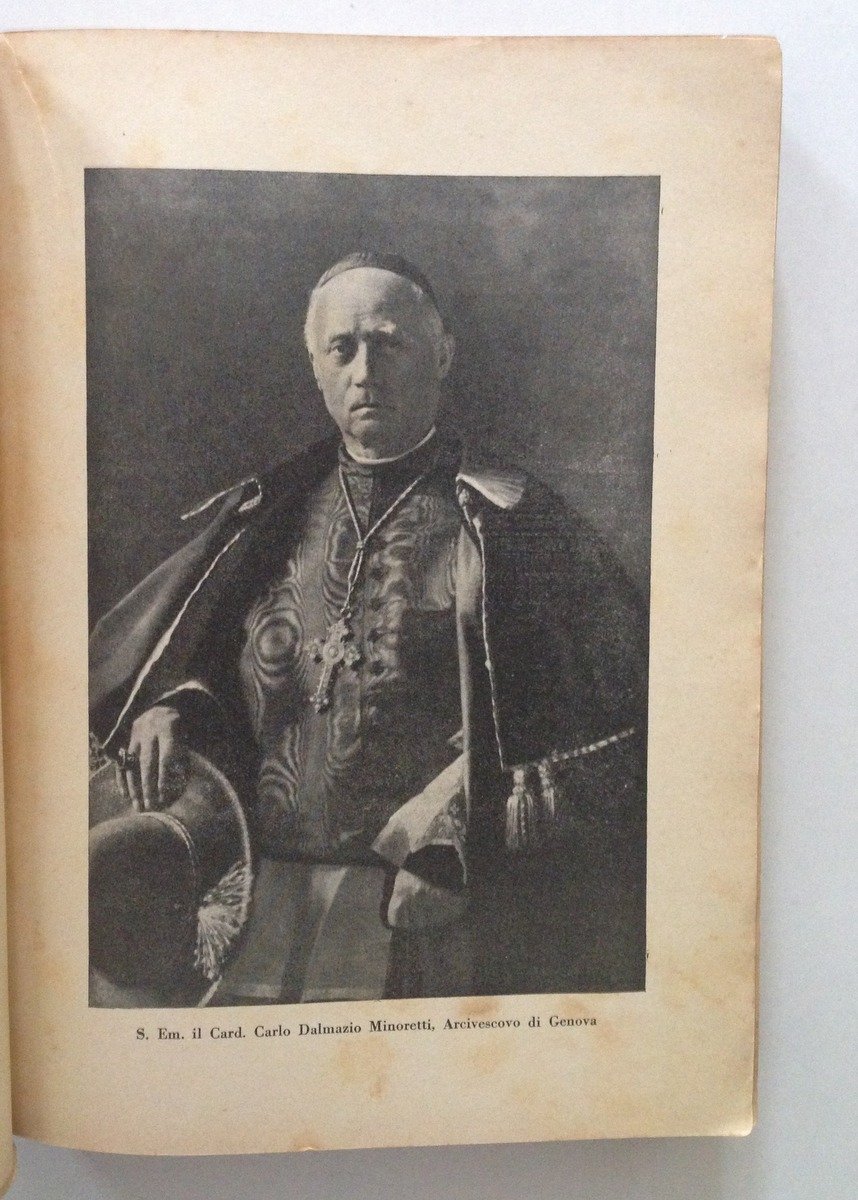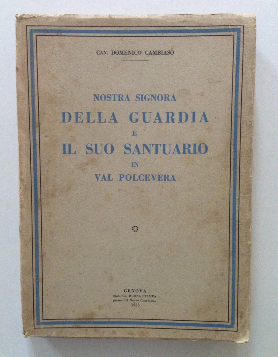 CAMBIASO DOMENICO, NOSTRA SIGNORA DELLA GUARDIA E IL SUO SANTUARIO IN VAL POLCEVERA GENOVA, BUONA STAMPA, 1933, in 8°, pp. XV-374, 57 ill. n.t. e 1 tav. rip. più volte, in terza pag. bella cromolitografia f.t. della Madonna a piena pag. che spesso manca, br. ed. Condizioni di conservazione Esemplare in buono stato con leggere tracce d'uso e con qualche brunitura; brossura editoriale con minimi strappetti e pieghette ai margini, agli angoli e al dorso; interni buoni. MM1033.E2-35