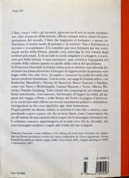 I libri, come i volti e gli incontri, agiscono su di noi in modo multiforme: oltre al piacere della lettura, offrono sempre nuove chiavi di interpretazioni del mondo. I libri che leggiamo ci formano, e spesso influenzano il nostro modo di pensare e di scrivere. Vita e letteratura si toccano e si scambiano. E lo scambio può non fermarsi qui ma continuare anche nella lettura, quando essa coinvolga la vita vissuta degli scrittori più amati. E ciò che accade in modo singolare se a leggere, e a scrivere poi della lettura, è una narratrice, una scrittrice impegnata nel mondo della cultura quando in quello della critica del quotidiano. In Francesca Sanvitale la lettura critica non si riferisce mai alla sola letteratura ma passa attraverso il bisogno di rappresentare la persona "che leggi" nella vita "che vive"; di capire e conoscere la realtà di coloro che hanno prodotto letteratura. Così avviene nei saggi di Camera ottica, con Katherine Mansfield e Simone de Beauvoir, Brude Chatwin e Pasolini, Come con Tasso e Michelangelo, Gianna Manzini e Neera, Alberto Moravia e Natalia Ginzburg. Tutti ritratti che compongono un sempre non finito autoritratto. Così nascono, dal bisogno di leggere la realtà, gli appunti del viaggio a Petra o nello Yemen del Nord e le pagine d'intervento in cui Sanvitale riflette sui recenti mutamenti politici e culturali interrogandosi su che cosa significhi oggi "fare letteratura".