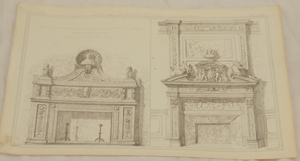 Bella litografia di architettura del 1882 tratta dal periodico mensile "Ricordi di architettura" pubblicato tra il 1878 e il 1900 diretto da Giacomo Roster, C. Corinti e E. Bartoli. La rivista documentava le numerose progettazioni, talvolta anche di riduzione e di ampliamento che fecero molti architetti dell'epoca. Di grandi dimensioni. TECNICA: Litografia DIMENSIONI FOGLIO: cm 53x38 DIMENSIONI INCISIONE: cm 48x34 EPOCA: 1882 CONDIZIONI: Buone condizioni, qualche fioritura e piccole parti mancanti ai margini. Beautiful lythography of architecture of 1882 taken from the monthly magazine "Ricordi di architettura" published between 1878 and 1900 directed by Giacomo Roster, C. Corinti and E. Bartoli. The magazine documented different projects, sometimes alos of reductioning and expansion done by many architects of that time. Of big size. TECHNIQUE: Lytography PAGE SIZE: cm 53x38 PRINT'S SIZE: cm 48x34 PERIOD: 1882 CONDITION: good conditions. Some yellowings and little missing parts in the edges