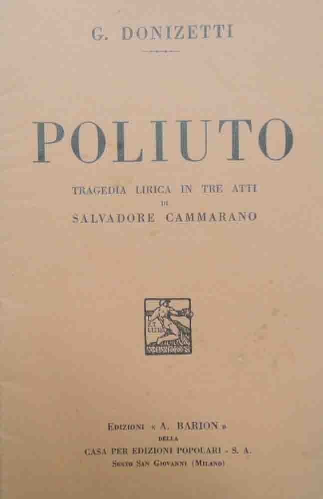 Poliuto. Tragedia lirica in tre atti di Salvadore Cammarano, musica di Gaetano Donizetti, Edizioni A. Barion della Casa per Edizioni Popolari S. A., Sesto San Giovanni (Milano) 1933, pp. 31, cm 18, opuscolo spillato. Timbro di libreria alla quarta di copertina. Lievi tracce d’uso, minime fioriture, leggera brunitura della carta, per il resto ben conservato.