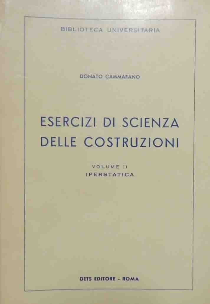 Donato Cammarano, Esercizi di scienza delle costruzioni. Volume II. Iperstatica, Dets Editore, Roma s.d. (ma 19?), pp. 325, ill. b.n., cm 24, br. ed. Collana Biblioteca Universitaria. Leggere tracce d’uso, qualche sporadica sottolineatura a biro, per il resto ben conservato.