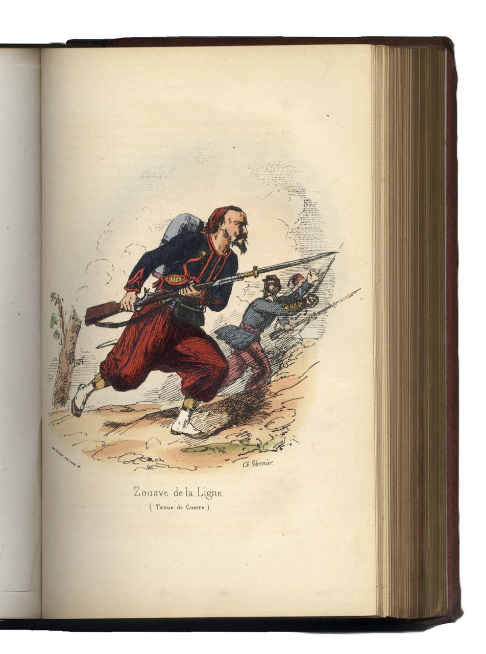 >2 parti in un vol. in-8 gr., pp. XII, 312; 328. Bella legatura originale in m. pelle con titolo e ricchi fregi oro al dorso, piatti in percallina con riquadri a secco, tagli dorati. Magnifica opera sulla seconda guerra d'indipendenza italiana, pubblicata a pochi mesi dagli eventi bellici. É splendidamente illustrata da 3 ritratti (Napoleone III, l'Imperatrice Eugenia, Vittorio Emanuele II), 4 carte topogr. ripieg., 5 tav. di battaglie e vedute e 16 tav. di uniformi militari a colori disegnate da Ch. Vernier. Rara e importante opera storica, completa ed in ottimo stato.