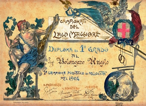 diploma ill. per i "Campionati del Lago Maggiore" formato 35,3X28 cm circa dato al Sig. Angelo Bolongaro, primo campione podistico di velocità nel 1904 con le firme del Presidente, Segretario e Giuria; buon es.