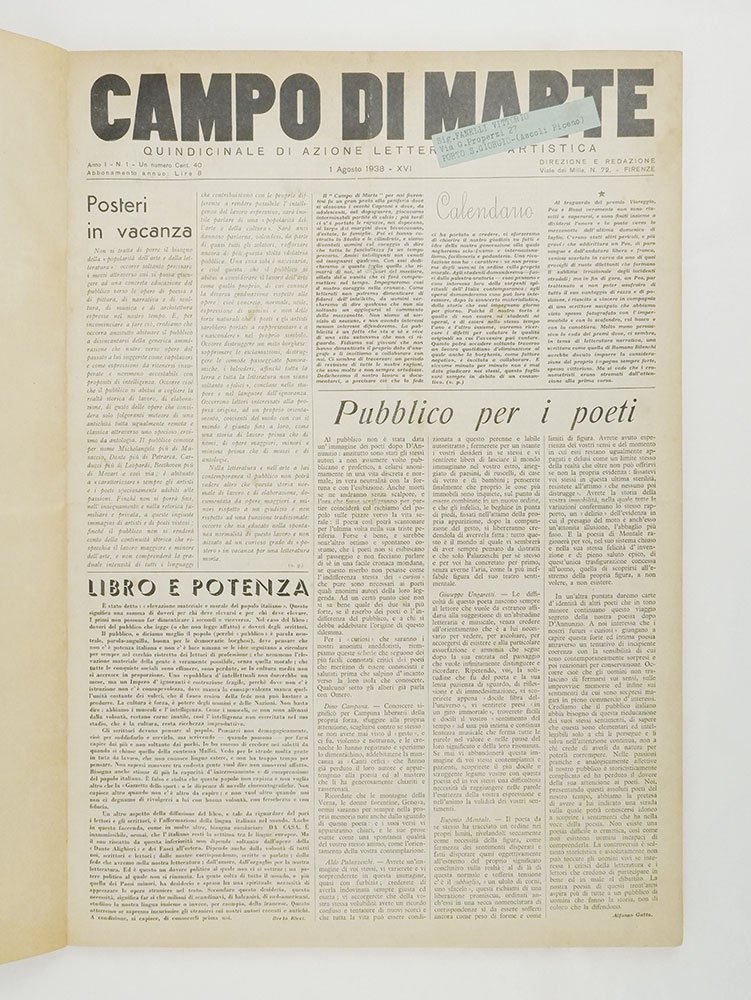 PERIODICOCollezione completa.Esemplare in ottime condizioni di conservazione (solo, come normale, la presenza dei segni di piegatura centrale dei fogli, con occasionali minime fenditure e con rinforzi in nastro adesivo al fascicolo dell’anno II, n. 4-5-6, pp. 2 e 8). Pecetta di spedizione all’abbonato «Sig. Fanelli Vittorio» alla prima pagina di ogni numero.Apparso nell’agosto 1938 (il n 1 reca la data del primo del mese), il bollettino quindicinale che prende il nome dal celebre quartiere fiorentino nasce dalla collaborazione tra l’editore Enrico Vallecchi e due giovani intellettuali militanti in piena ascesa, Vasco Pratolini e Alfonso Gatto. Il primo, curioso tipo di vorace autodidatta, ha appena ventiquattro anni e questa esperienza gli è un vero battesimo di fuoco: ha respirato a pieni polmoni la ‘fiorentinità’ di Ottone Rosai e dei suoi giovani eredi del «Bargello», ma già se ne distacca seguendo Vittorini, Montale e soprattutto Alfonso Gatto, che con «Morto ai paesi», la seconda raccolta di poesie appena pubblicata da Guanda (1937), è diventato un «punto di riferimento e quasi bandiera del rinnovamento della poesia» (Bandinelli, voce de DBI). Vallecchi vuole fare un bollettino editoriale (da cui i numerosi articoli di bibliofilia, biblioteconomia, sociologia della lettura e cultura editoriale, assai interessanti), ma va a finire che Pratolini ci mette una buona dose di irrequietezza militante (proto)antifascista, espressa massimamente nella pungente colonna «Calendario» (dopo appena due numeri prudenzialmente spostata in seconda pagina), e Gatto vi dirotta in pieno il dibattito sull’ermetismo, appena nato: ne esce un foglio effettivamente «d’azione», diffuso a larga tiratura ad un prezzo irrisorio, in cui «il fascismo ufficiale vedeva riapparire, non più sotto forma di grossa costosa rivista trimestrale per iniziati come “Letteratura”, ma quale giornalino da quaranta centesimi ogni quindici giorni, l’europeismo di “Solaria”, che tanto aveva faticato a reprimere» (Jacobbi). Dopo appena una dozzina di densi fascicoli regolari, a partire dal febbraio 1939 le uscite si rarefanno: bisogna aspettare oltre un mese per il numero triplo II,3-4-5 (15 marzo); ancora un mese per il doppio II,7-8 (15 aprile). Gli articoli di fondo denunciano le pressioni subite: «Fine della commedia», «Punti fermi». I numeri 9 e 10 dell’anno secondo escono regolarmente, ma è un fuoco di paglia: la rivista chiude dopo il numero doppio 11-12, nell’agosto, esattamente un anno dopo l’inizio, con un bel «Congedo provvisorio» firmato da Alfonso Gatto che si chiude così: «Ora, forse, è giusto ch’io mi rivolga solo a Pratolini e ricordi la nostra cura, il nostro amore spesi ogni ogni volta a curare e a comporre nota per nota, articolo per articolo, disegno per disegno, pagina a pagina, questo nostro foglio che l’estate tenne a battesimo su una terrazza di Greve. È stato un anno della nostra vita che io e Pratolini, più di tutti, non potremo mai dimenticare». -- Al di là del dato antifascista, «Campo di Marte» fu un momento indispensabile del formarsi della coscienza e del canone letterario italiano del Novecento; un foglio su cui si tracciarono gli alberi genealogici della giovane poesia degli anni ’30, su cui venne fissata per la prima volta con sorprendente chiarezza la linea dei maestri (il «dopo D’Annunzio»: Campana, Palazzeschi, Ungaretti, Montale) e degli allievi (Gatto, Bigongiari, Luzi, Quasimodo, Betocchi, Parronchi), con l’ausilio critico di Carlo Bo, Oreste Macrì ed Enrico Falqui. Da registrare inoltre le rilevanti presenze di Tommaso Landolfi (ben quattro racconti inediti), Gianna Manzini, Leonardi Sinisgalli (a partire dal 1939), le poesie di Sandro Penna, e, più episodici, Antonio Delfini, Romano Bilenchi, Vittorio Sereni. --Tra i collaboratori fissi, meno noti ma assai saporosi sono i nomi di Petroni, Franchi, Ricci, Ulivi, Vigorelli, Ferrata, Hermet, Dal Fabbro (memorabile la miniserie dei «Paragrafi sul tradurre»), Berti, Altichieri, Ferroni, Ghiara, Santi. Una ‘squadra’ in grado di recepire criticamente quanto di meglio andava producendosi in tutto il mondo e a trecentosessanta gradi, con la cronaca d’arte affidata a Giulia Veronesi, quella dell’architettura ad Anna Maria Mazzucchelli, e Ferdinando Ballo sulla musica. Sul lato iconografico il foglio è abbellito da delicate vignette di tono metafisico e novecentista, firmate da Carlo Carrà, Giorgio Morandi, Bruno Becchi, Ottone Rosai, Luigi Broggini, Onofrio Martinelli, Arturo Tosi, Carlo De Roberto, Ugo Capocchini, Giovanni Colacicchi, Domenico Cantatore, Gabriele Mucchi, Renato Guttuso. -- I fragili fascicoli formato giornale di «Campo di Marte» sono oggi molto rari; rarissima la collezione completa.Bibl.: Jacobbi, Campo di Marte trenta anni dopo (Firenze 1969); Luti (cur.), Campo di Marte: ristampa anastatica (Firenze 1981); Grassellini, Campo di Marte (Pisa 1984); scheda CIRCE online (con amplia bibliografia)