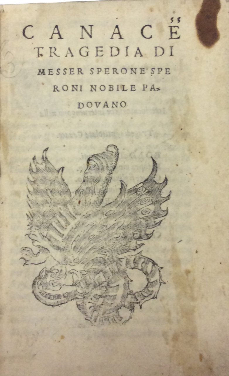 In-24 gr. (mm. 140x89), brossura muta stile Settecento, da c. 55 a c. 95, tagli azzurri. Vi è contenuto il testo della tragedia, con frontespizio a se' e marca tipografica che viene ripetuta, più in grande ed entro cornice, al verso dell'ultima carta. Manca l'ultima c.b. "Seconda edizione".Cfr. Gamba, 1653 (in nota alla prima edizione del 1546, Venezia, Valgrisi): Preceduta da un "Giudizio sopra la Tragedia", attribuito da alcuni a Bartolommeo Cavalcanti, si ristampò poi in Lucca, Busdrago, 1550 - Adams,II,1573. Il ns. esemplare è privo della prima parte con il Giuditio.Frontespizio con macchia al margine bianco, altrimenti ben conservato.