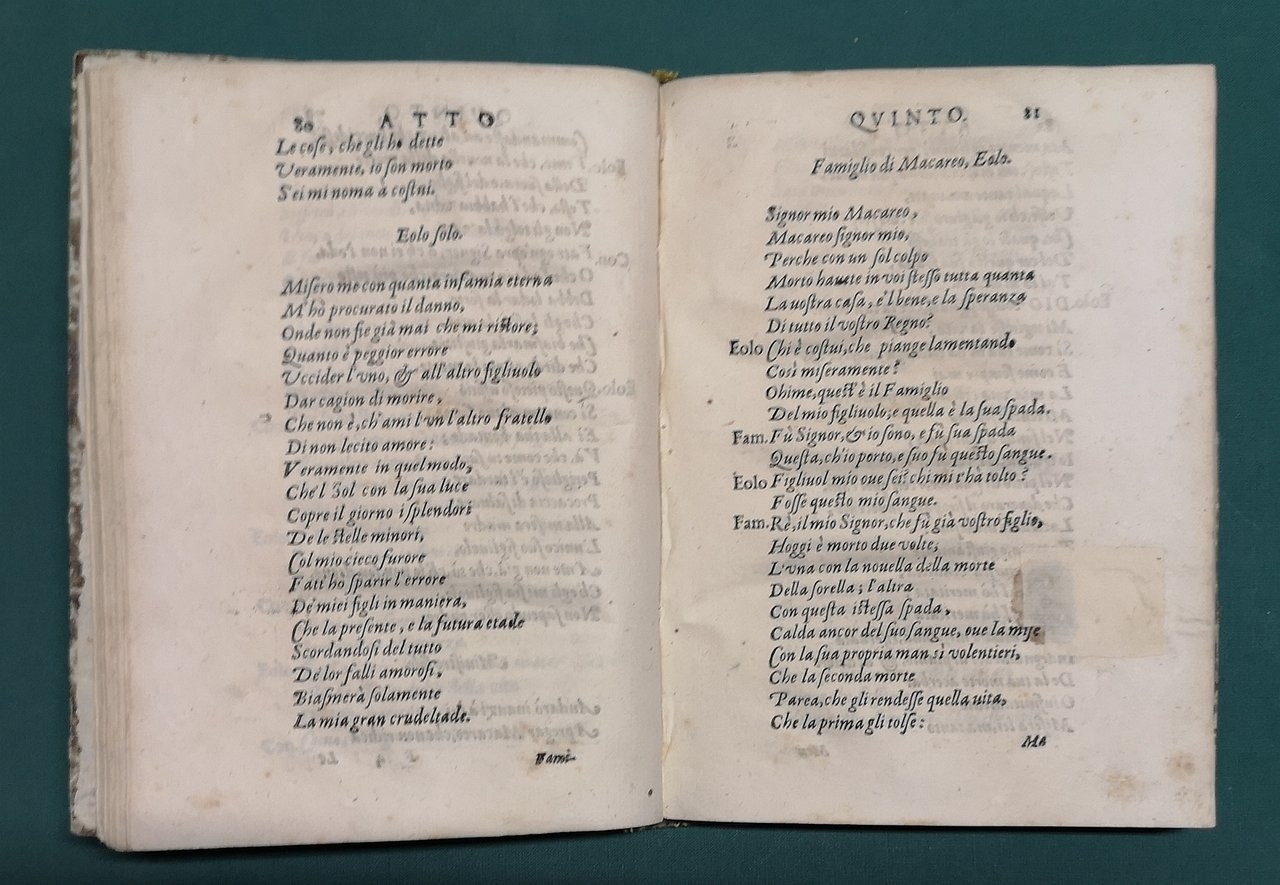 >in-4, pp. (8), 253, leg. m. perg., tracce di tassello in carta al dorso. Impresa tipogr. al tit., iniz. silogr. Pregevole edizione, probabilmente la sesta (la prima era apparsa nel 1546), di questa tragedia in cinque atti, senza divisione di scene, in versi settenari (frammisti a endecasillabi e ad alcuni quinari), tra le più note ed influenti del Cinquecento, soprattutto per il gusto all'esposizione di eventi truci e nefandi (la trama si basa sull'incesto di due gemelli). Procurata da Ingolfo de' Conti, che la dedica al Duca Alfonso d'Este, contiene, aggiunto qui per la prima volta, il ''Prologo in persona di Venere'' e comprende le varie composizioni che Speroni scrisse in difesa del suo lavoro e contro il ''Giudizio'' del Cavalcanti. Discreto esemplare (menda a pag. 81). Allacci 159. Clubb 802. Salvioli 620. Gamba 1654. BMC 636. Adams A-1564. Fontanini, Bibliot. eloquenza ital. I, p. 470.