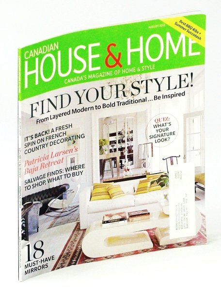 Features: Stylemaker 1 - With organic elements and natural tones, Vancouver artist Patricia Larsen's Mexican home mirrors her pared-back poetic leanings; Stylemaker 2 - Decorator Sabrina Linn takes her signature blend of glam, vintage and modern from industrial loft to Georgian-style home; Stylemaker 3 - A move from city to country lets Vi Jull reinvent her classic Provencal style with a 'less is more' approach; Style Quiz - Find your own decorating identity; Recipes for an American feast; Luxe pieces for a glamorous living room; Designer Thomas Smythe takes us on the hunt for beautiful architectural remnants; Handsome tiered garden of Rene and Priscilla Wikkerink boasts two great entertaining spaces; All the latest looks in mirrors; and more. 108 pages. Unmarked with moderate wear. A quality copy. Magazine