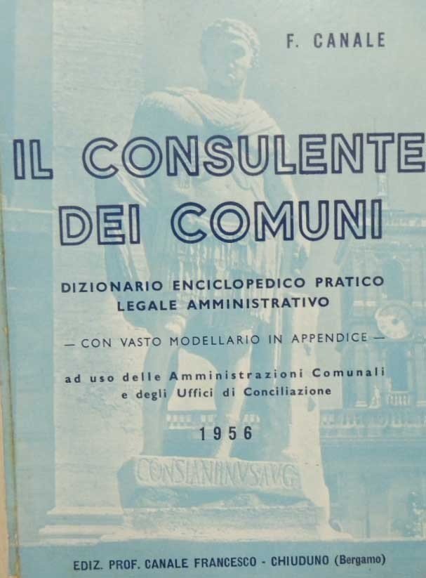 Francesco Canale, Il consulente dei comuni. Dizionario enciclopedico pratico legale-amministrativo. Con vasto modellario in appendice. Ad uso delle Amministrazioni Comunali e degli Uffici di Conciliazione, Edizioni Prof. Canale Francesco, Chiudono (Bergamo) 1956, pp. 775, cm 22, cart. ed. con titoli al dorso e titoli e ill. al piatto. Leggere tracce d’uso, una mancanza alla carta di guardia anteriore, fioriture diffuse, ma nel complesso volume ancora in buono stato. Non comune.