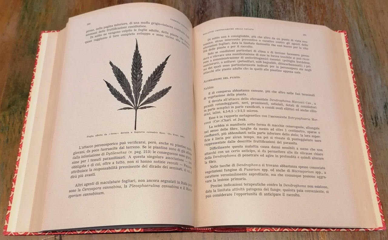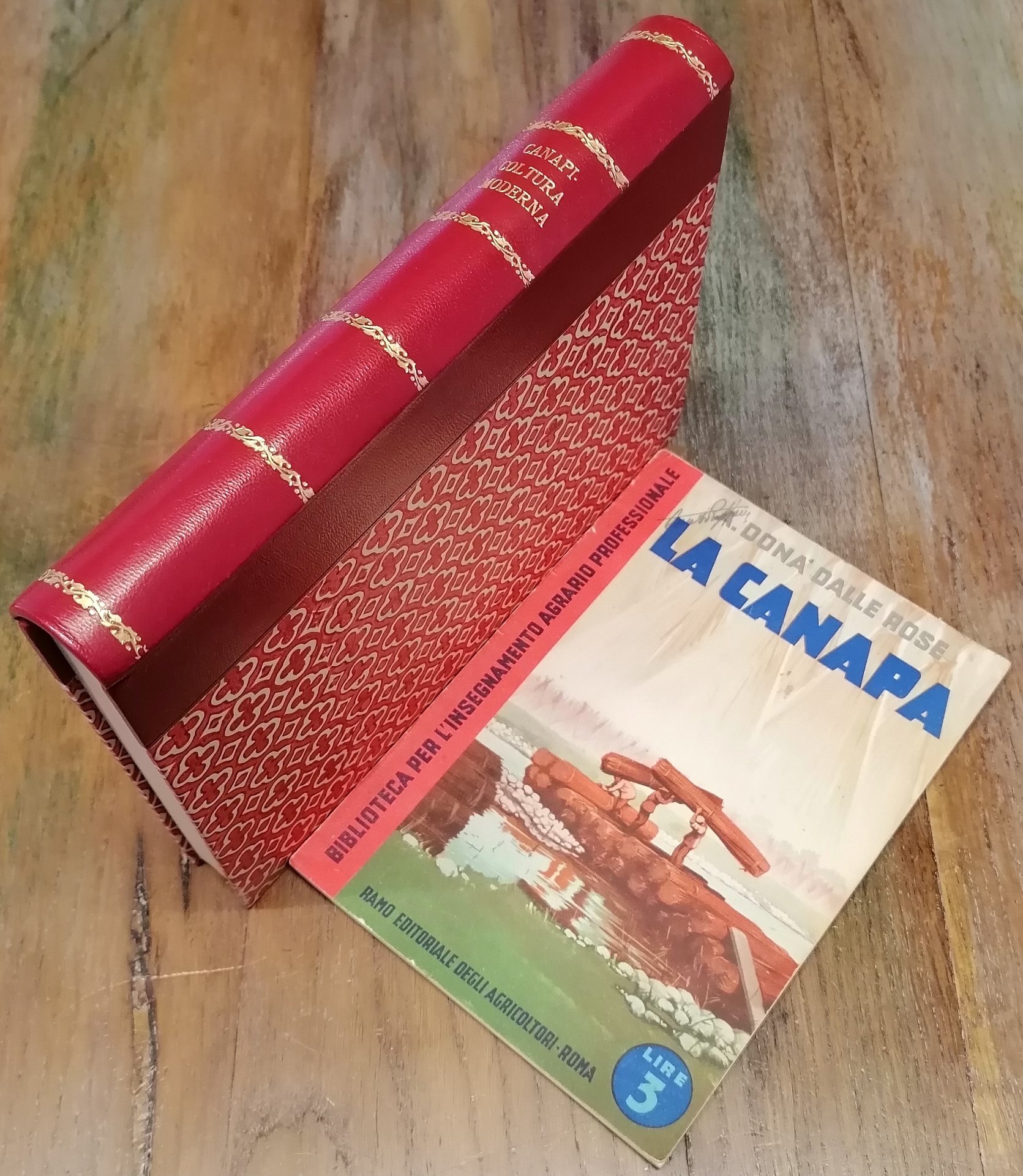 (Canapa italiana; Coltivazione; Storia; Tecnica agraria; Fibre tessili vegetali) In 8°, legatura in mezza pelle rossa con titoli ed impressioni in oro, conservate le copertine della brossura editoriale, pp. VIII,507,(1), con numerosi disegni (alcuni a colori) ed illustrazioni fotografiche nel testo. Piccolo timbro di biblioteca estinta di circolo privato al frontespizio. Contributi di : Magda Franca Rabaglietti, Francesco Crescini, Giuseppe Ragazzi, Raffaele Barbieri, Tommaso Bruna, Gabriele Goidànich, Maria M. Principi, Mario Sacchetti, Giuseppe Stefanelli, Luigi Perdisa, Vincenzo Patuelli, Ferdinando Pagani, Augusto Fabbri Ravegnani, Salvatore Turri, Giorgio Bianchini, Italico Sgherri, Agostino Del Prete. Volume entrato ormai nella bibliografia relativa alla storia della coltivazione della canapa in Italia. Alleghiamo l' opuscolo di A. Donà Dalle Rose "La canapa (Coltivazione e utilizzazione industriale)" , Roma, Ramo Editoriale degli Agricoltori, 1938, pp. 66 con disegni nel testo e tavole fotografiche fuori testo + foto originale (cm 12,5 x 16,5) di una esposizione di settore del 1923. Ottimo stato di conservazione.