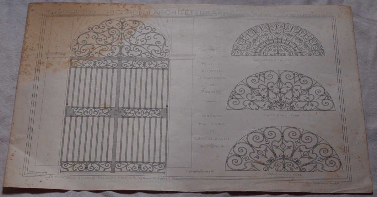 CANCELLO E ROSTE DI PORTE D'INGRESSO IN FIRENZE DISEGNO DAL VERO DI G. PATRIGNANI