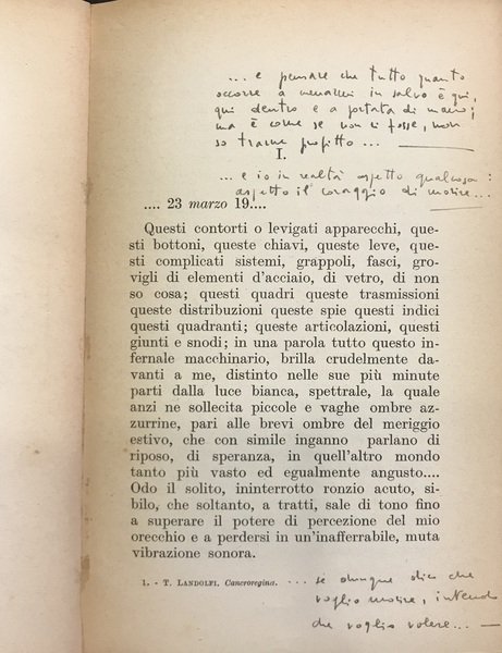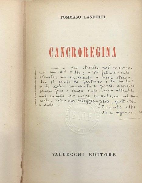 Prima edizione, 1950. Brossura editoriale con sovraccoperta editoriale illustrata a colori da Rossini (al risvolto, uno dei rari ritratti fotografici di Landolfi che non amava farsi ritrarre in foto), pp 105, cm 19x12,5 cm. Il volume contiene una vecchia firma di appartenenza alla prima carta, datata 1952 e una lunga ed elegante annotazione sul frontespizio, che prosegue sulla prima pagina del libro, a margine del testo. Esemplare in condizioni molto buone, con minime mancanze al dorso. Edizione rarissima a reperirsi in queste condizioni di conservazione.