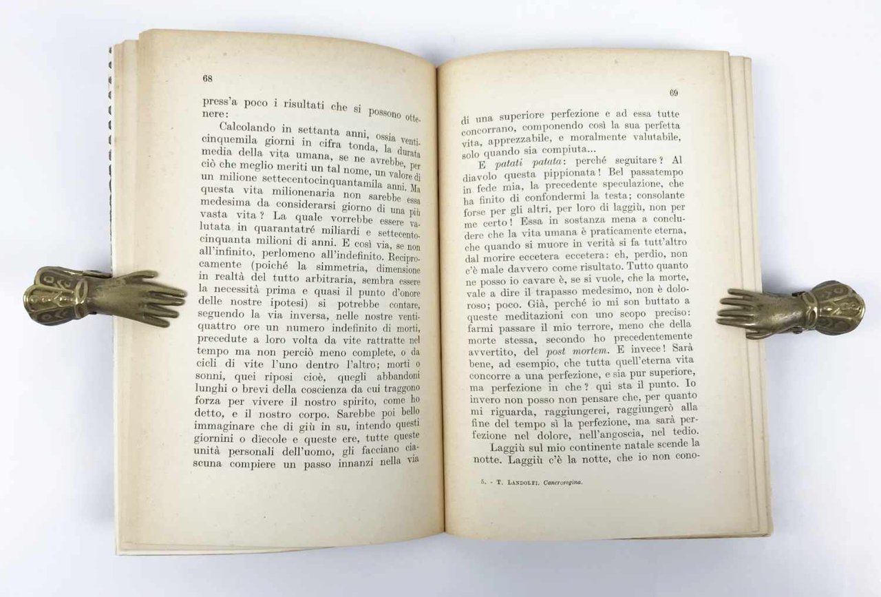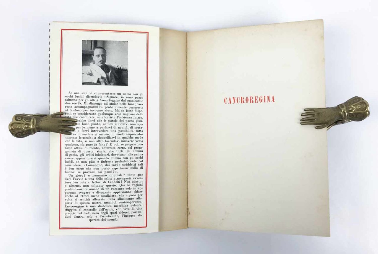LIBROEdizione originale.Piccola mancanza alla parte alta della cerniera anteriore, e minimo distacco senza perdita al piede del dorso; per il resto un ottimo esemplare, pulito, completo della rara sovracoperta e di una bella fascetta editoriale.Primo e unico romanzo di fantascienza di Landolfi, che interpretò in chiave estremamente personale il genere: «Nella disperata condizione del protagonista (che, dopo essersi fatto convincere a partecipare a un viaggio verso la luna, si ritrova a orbitare solitario intorno alla terra, senza poter far nulla per cambiare il proprio destino) si può probabilmente leggere un'autorappresentazione dell'autore. La seconda parte del libro è costituita dalle annotazioni del protagonista; si passa quindi dal registro narrativo a quello diaristico, facendo intravedere quella che di lì a poco si sarebbe rivelata una svolta nella letteratura dell'autore» (Luigi Matt, «Landolfi», voce del «Dizionario biografico degli Italiani», volume 63, 2004). Il ritratto fotografico al risvolto è una delle rarissime immagini dell'autore che non amava mostrarsi in pubblico: Landolfi, ai premi letterari, quando veniva invitato a presenziare sul palco, per scherno offriva alla platea le proprie terga.