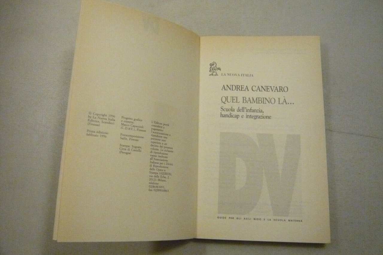 Andrea CanevaroQUEL BAMBINO LÀ…Scuola dell’infanzia handicap e integrazioneDidattica viva n.248La Nuova Italia Editori, Perugia, 1999Bassura, 21x13cm, pp.170Peso: 180g