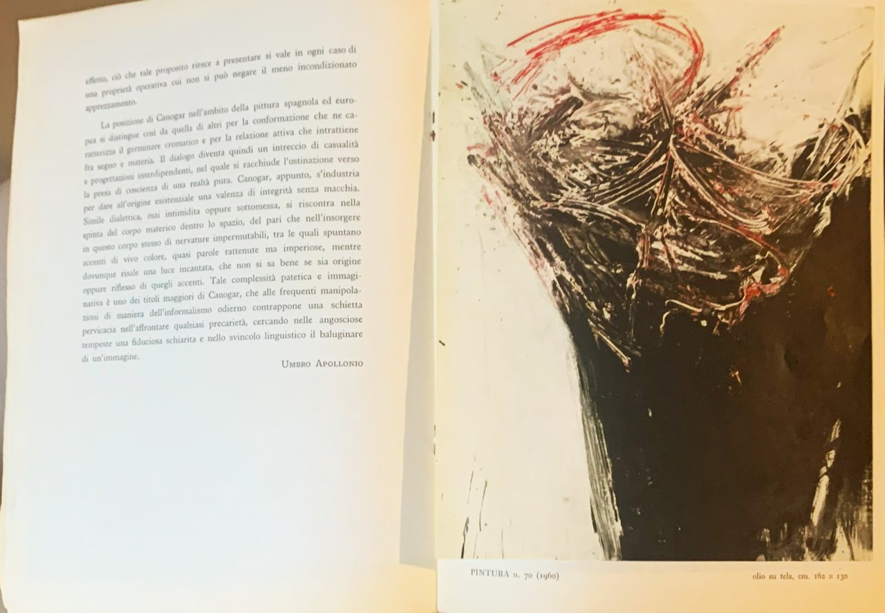 Catalogo della mostra inauguratasi presso la galleria Attico di Roma il 13 maggio 1961. Con saggio critico di Umbro Apollonio e "Indicazioni bibliografiche". Opere: A Oscar Dominguez, 1960 - Serie negra, 1959 - Pintura, 1960 (2), Vespa, 1959 - Gallo, 1960 In-4, pp. (12), brossura in cartoncino rosso esternamente fermata con due punti metallici al dorso e con titoli in nero ai piatti. Con 6 illustrazioni in tavole patinate di cui 2 a colori applicate.Stato buono