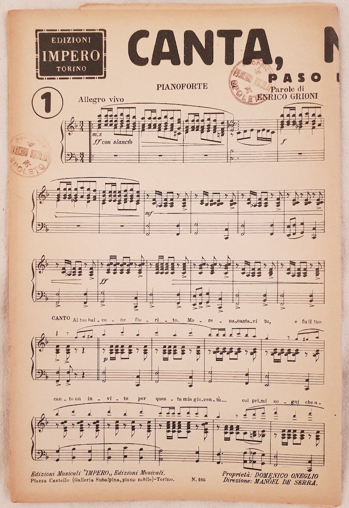 Bello spartito, partitura completa per orchestra senza data ma degli anni '30 di due canzoni di Oneglio.<BR>Copertina mancante. GENERE: One step, Paso Doble STRUMENTI: pianoforte, violino, violoncello, contrabasso, clarinetto, flauto, sassofono, batteria, trombe, trombone ANNO: anni '30 DIMENSIONI: In 8. cm 27x18 PAGINE: 26 CONDIZIONI: In buone condizioni NOTE: Ex libris alla prima pagina Beautiful score of two songs, a complete score for orchestra of 1930's of two songs of Oneglio. Cover is missing MUSIC: One step, Paso Doble STRUMENTI: piano; violin; violoncello; contrabbass; clarinet, flute, saxophone, drums, trumpet, trombone <BR>YEAR: 1930's SIZE: In 8. cm 27x18 PAGES: 26 CONDITIONS: In good conditions NOTES: Ex libris in the pages