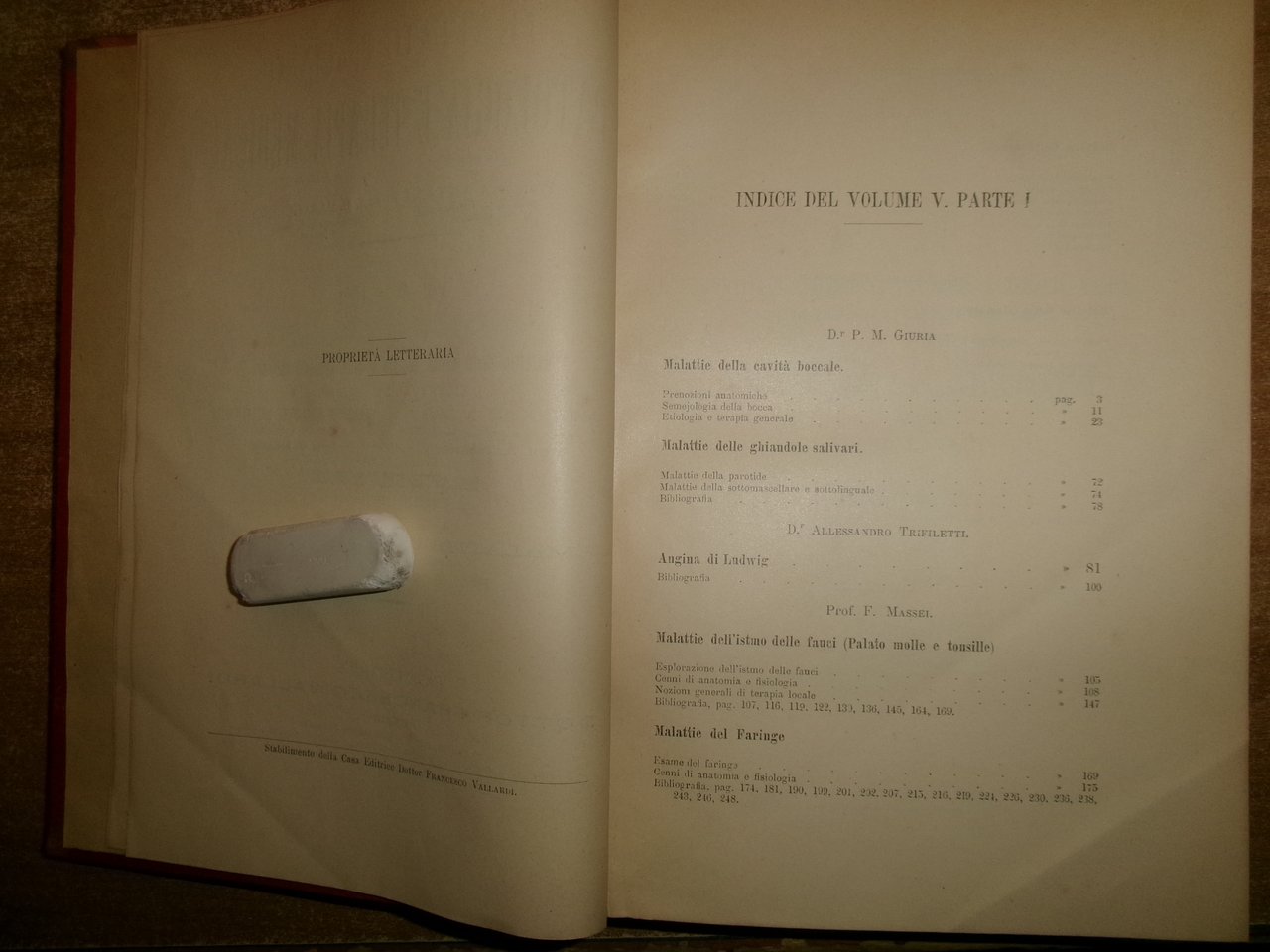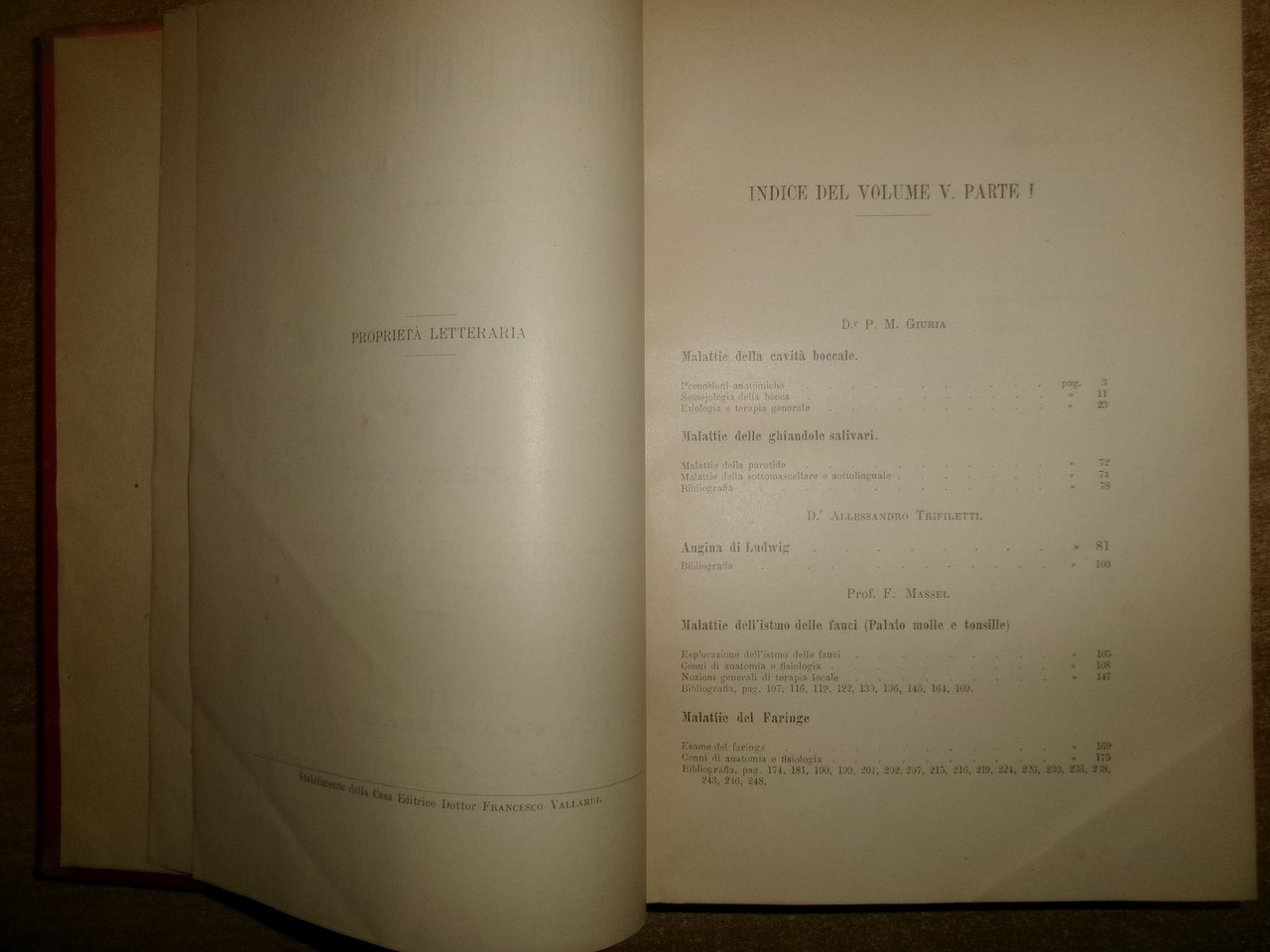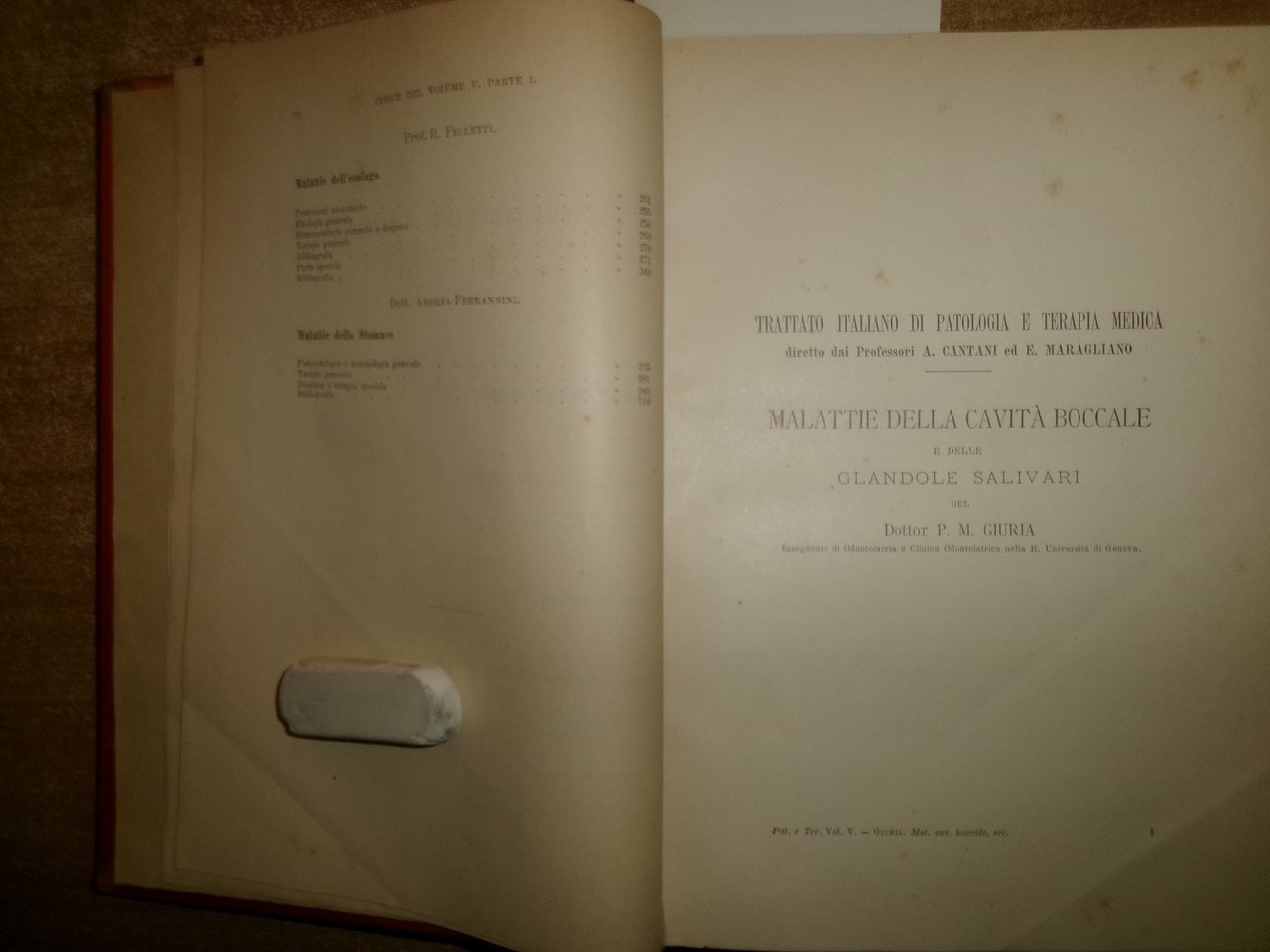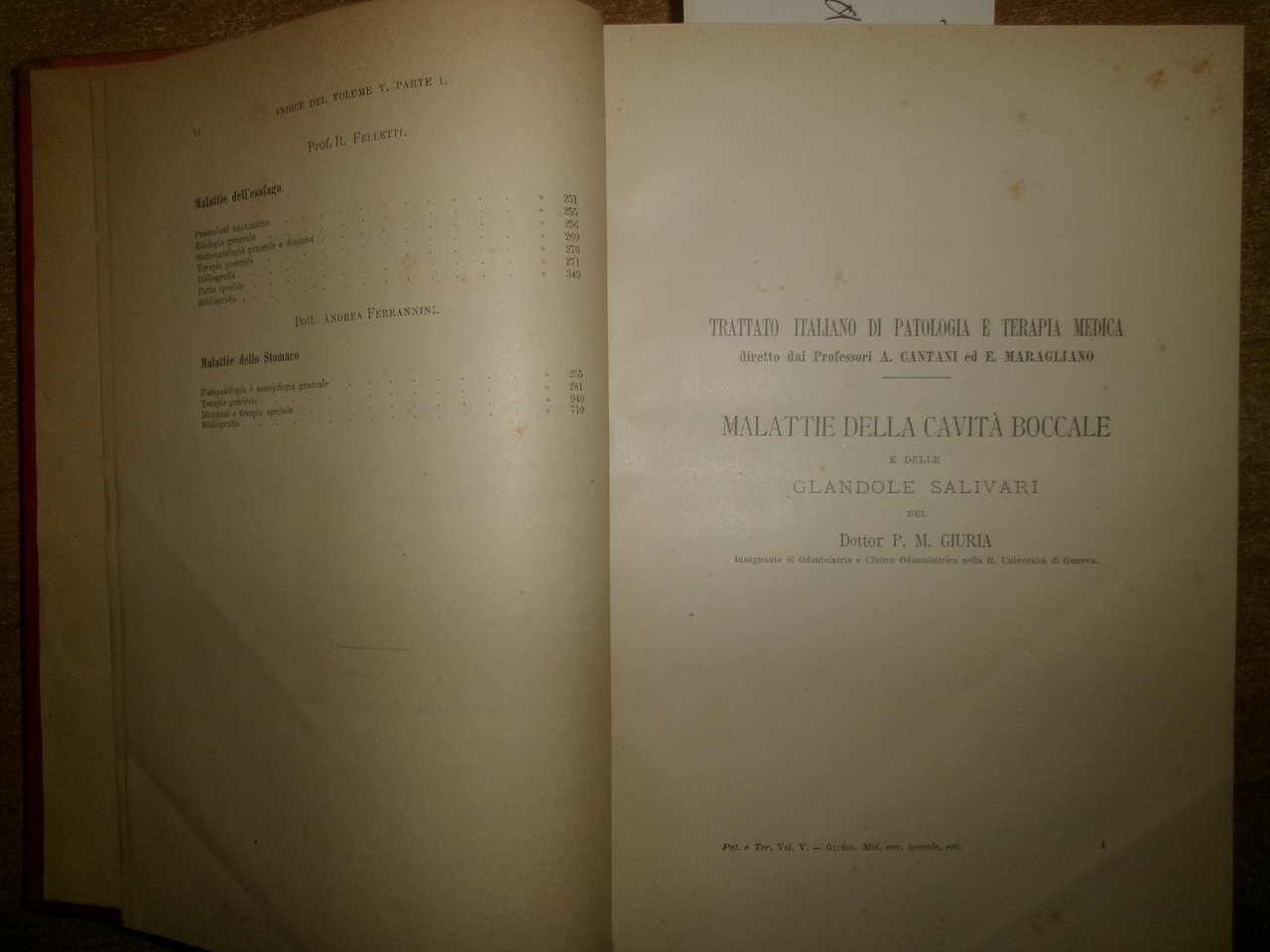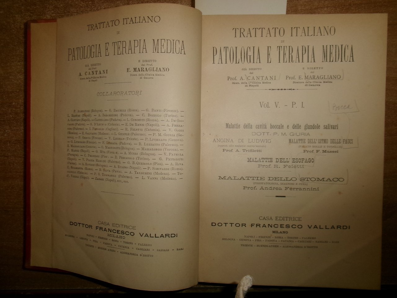 AA. VV. Prof. A. Cantani - E. Maragliano. Milano, Francesco Vallardi, s.d. (fine ottocento). Trattato Italiano Di Patologia E Terapia Medica... Vol. V. P. I. Malattie della cavità boccale e delle glandole salivari - Malattie dello stomaco - Malattie dell' esofago. In-8°, tela edit. con titolo in oro al dorso. vi, 732 pp. con numerose figure in nero n.t. Ben conservato con normali segni del tempo. Uff. salon. sporta 6