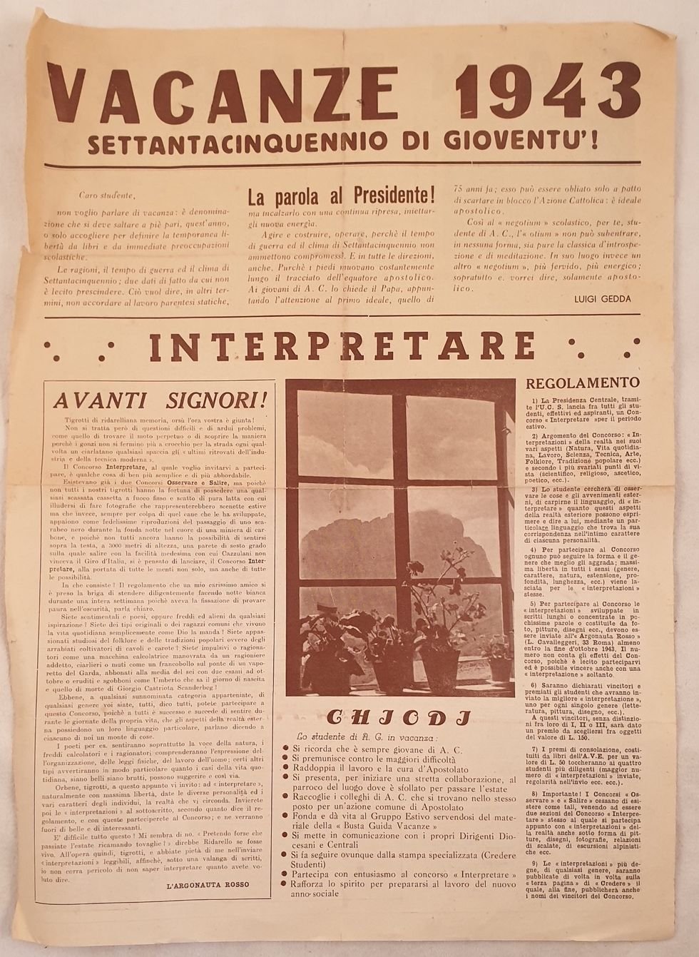 Volantino edito dalla Gioventu di A.c.i. di Roma in occasione delle Vacanze del 1943. Presentazione e regolamento nella prima pagina. Seguono testi di canzoni: Caro studente, Lasciateci pasare, Notte Ju, Inno ufficiale, Jukaidi, Il canto del maturando, La Santa Caterina. Piegature e piccoli strappi marginali. In buone condizioni. In folio cm 44x32. Pp. (2) Pamphlet edited by Gioventu di A.c.i. of Rome in occasion of holidays of 1943. Introduction and rules int he first page. Then texts of songs: Caro studente, Lasciateci pasare, Notte Ju, Inno ufficiale, Jukaidi, Il canto del maturando, La Santa Caterina. Foldings and little tears in the edges. In good conditions. In folio cm 44x32. Pp. (2)