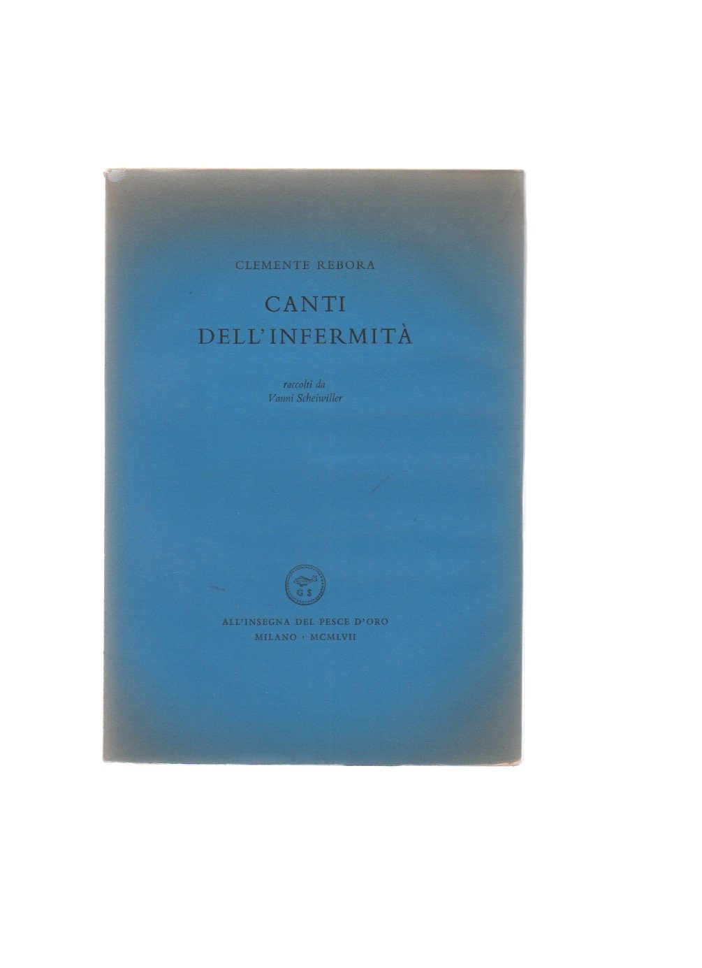 LIBROSeconda edizione accresciuta.Ottimo esemplare, brossura scolorita e carte interne marginalmente brunite. Conserva la fascetta e l’acetato editoriale. Copia n. 19/1000Seconda edizione accresciuta dei «Canti dell’infermità» del poeta e sacerdote Clemente Rebora, scomparso nel 1957. Originariamente pubblicata nel 1956, questa raccolta di poesia è qui curata da Vanni Scheiwiller ed edita dalla sua All’insegna del Pesce d’Oro in tiratura limitata e numerata.Cicala e Rossi, Bibliografia reboriana, p. 21