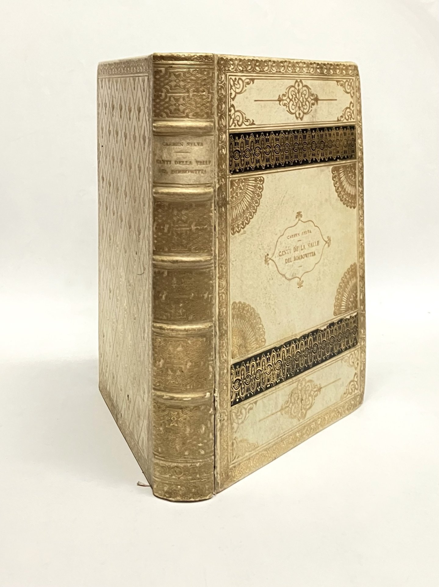 Elegante legatura coeva in piena pergamena, piatti incorniciati con fregi fitomorfi e decorati con impressioni in oro (quello anteriore con ricchi fregi a ventaglio e due filetti su fasce in pelle blu, quello posteriore con gigli araldici entro losanghe), dorso a 5 nervi e ribattitura decorati con fregi in oro, titoli in oro al piatto e al dorso, taglio superiore dorato, risguardi in carta marmorizzata, segnalibro in stoffa col tricolore italiano. Taglio alla cerniera anteriore e ai contropiatti (ma legatura solida), segno a penna al piatto posteriore, esemplare in barbe all'interno in ottimo stato.